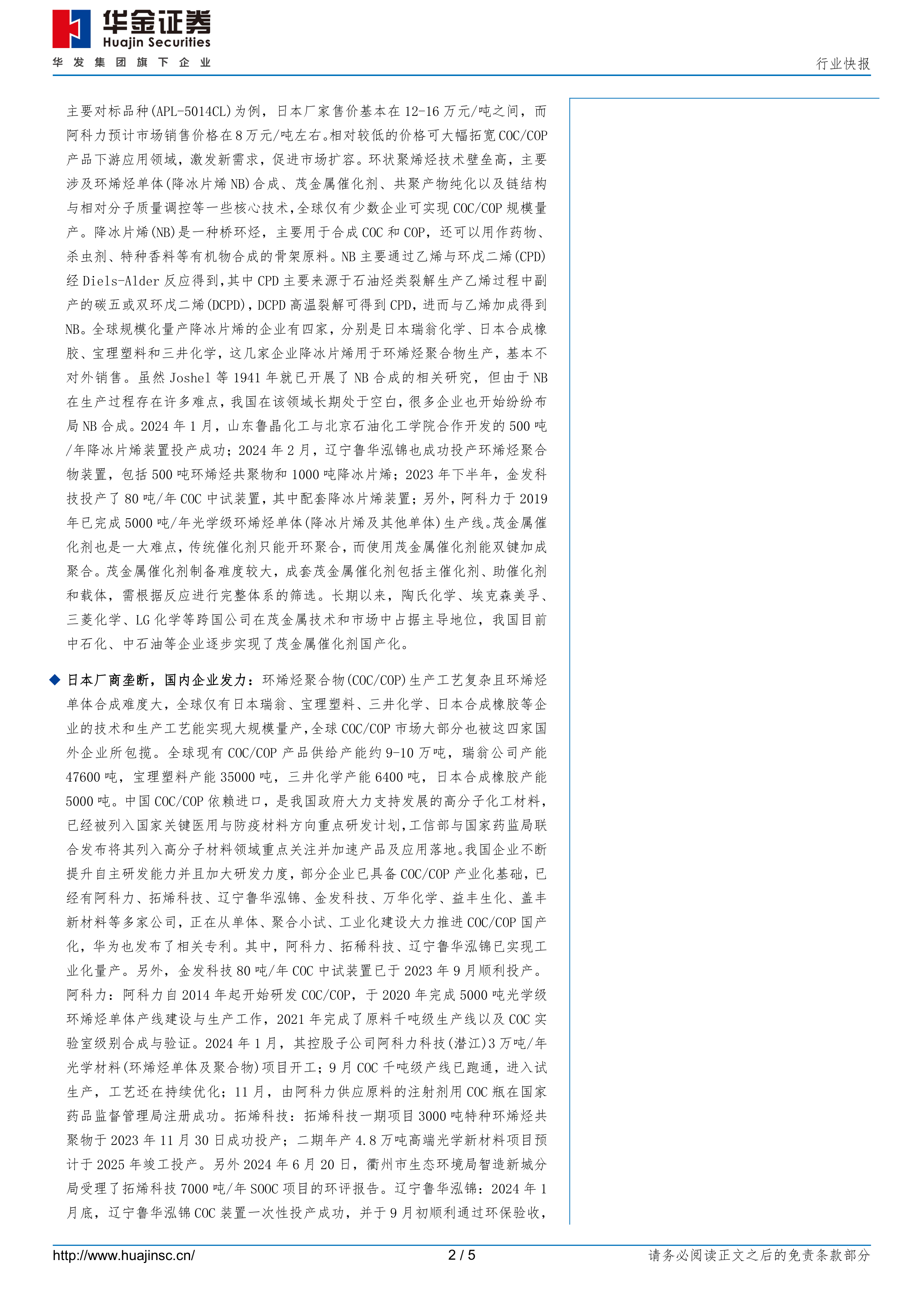 日本厂商垄断,国内企业发力:环烯烃聚合物(COC/COP)生产工艺复杂且环烯烃单体合成难度大,全球仅有日本瑞翁、宝理塑料、三井化学、日本合成橡胶等企业的技术和生产工艺能实现大规模量产,全球COC/COP市场大部分也被这四家国外企业所包揽。全球现有COC/COP产品供给产能约9-10万吨,瑞翁公司产能47600吨,宝理塑料产能35000吨,三井化学产能6400吨,日本合成橡胶产能5000吨。中国COC/COP依赖进口,是我国政府大力支持发展的高分子化工材料,已经被列入国家关键医用与防疫材料方向重点研发计划,工信部与国家药监局联合发布将其列入高分子材料领域重点关注并加速产品及应用落地。我国企业不断提升自主研发能力并且加大研发力度,部分企业已具备COC/COP产业化基础,已经有阿科力、拓烯科技、辽宁鲁华泓锦、金发科技、万华化学、益丰生化、盖丰新材料等多家公司,正在从单体、聚合小试、工业化建设大力推进COC/COP国产化,华为也发布了相关专利。其中,阿科力、拓稀科技、辽宁鲁华泓锦已实现工业化量产。另外,金发科技80吨/年COC中试装置已于2023年9月顺利投产。阿科力:阿科力自2014年起开始研发COC/COP,于2020年完成5000吨光学级环烯烃单体产线建设与生产工作,2021年完成了原料千吨级生产线以及COC实验室级别合成与验证。2024年1月,其控股子公司阿科力科技(潜江)3万吨/年光学材料(环烯烃单体及聚合物)项目开工;9月COC千吨级产线已跑通,进入试生产,工艺还在持续优化;11月,由阿科力供应原料的注射剂用COC瓶在国家药品监督管理局注册成功。拓烯科技:拓烯科技一期项目3000吨特种环烯烃共聚物于2023年11月30日成功投产;二期年产4.8万吨高端光学新材料项目预计于2025年竣工投产。另外2024年6月20日,衢州市生态环境局智造新城分局受理了拓烯科技7000吨/年SOOC项目的环评报告。辽宁鲁华泓锦:2024年1月底,辽宁鲁华泓锦COC装置一次性投产成功,并于9月初顺利通过环保验收,该项目年产环烯烃共聚物500吨、降冰片烯(折100%降冰片烯)1000吨,一期示范项目完成后,计划二期建设10000吨/年环烯烃聚合物生产装置。