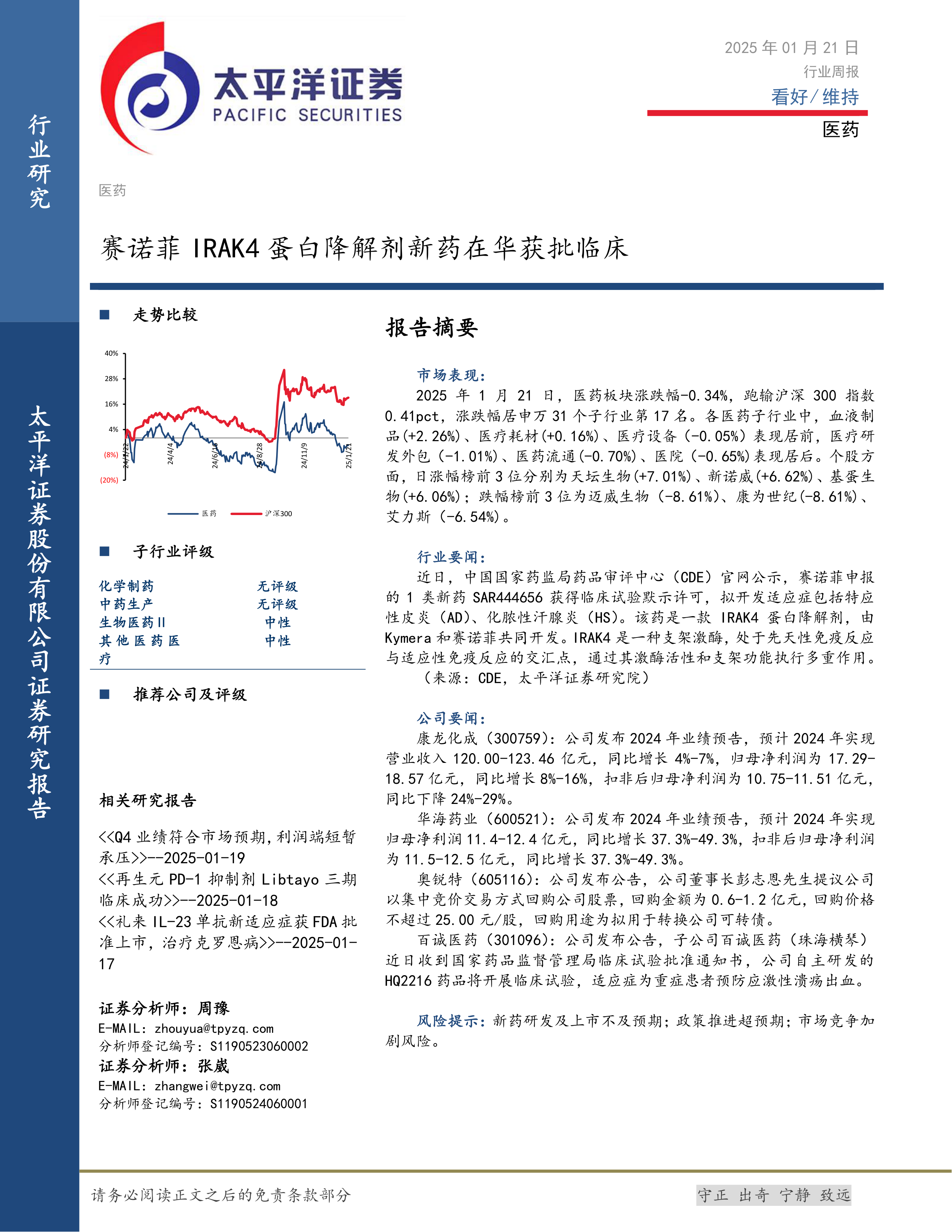 本报告的核心观点是:医药板块整体表现略逊于沪深300指数,但部分子行业表现亮眼,赛诺菲IRAK4蛋白降解剂新药获批临床试验是行业重要进展,部分公司业绩预告显示增长态势。