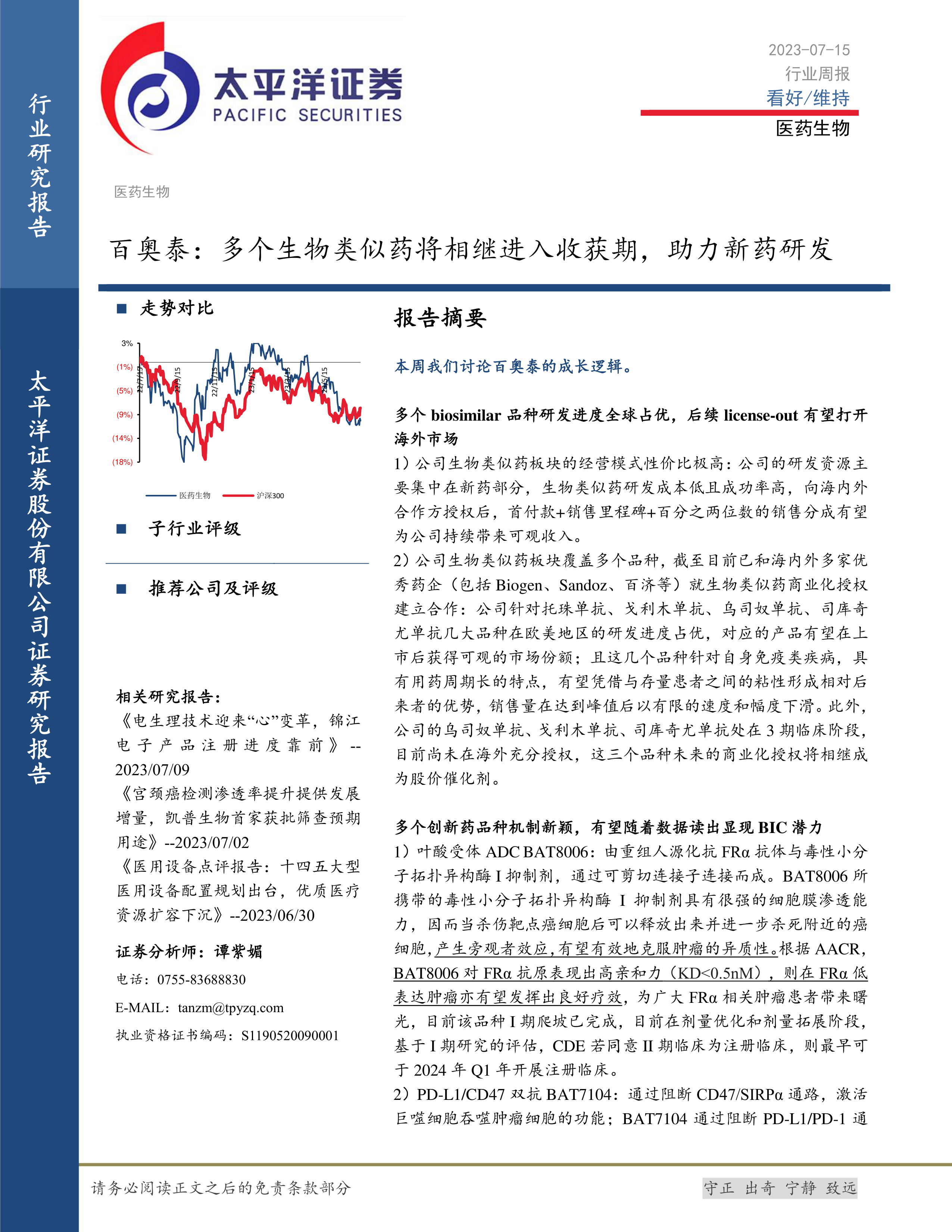 本报告的核心观点是:百奥泰凭借其高性价比的生物类似药经营模式和多个处于全球领先地位的生物类似药品种,有望在未来几年进入收获期,并通过持续的海外授权合作,获得可观的收入,同时其创新药研发管线也展现出巨大潜力。 医药行业整体在疫后复苏,第二季度业绩有望实现高增长,但仍需关注行业监管政策变化、市场竞争加剧等风险。