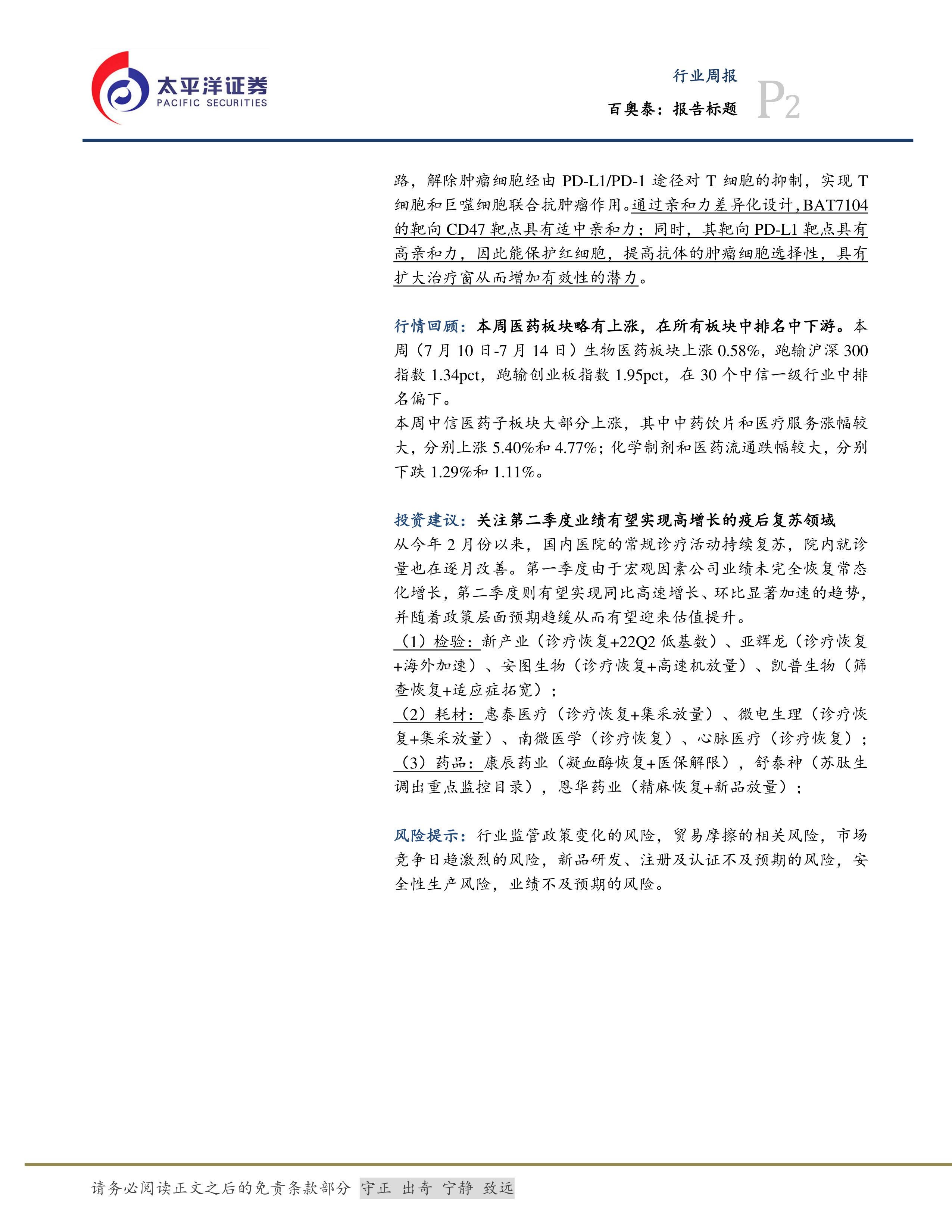 本报告对百奥泰公司及其所在的医药行业进行了深入分析。百奥泰凭借其高性价比的生物类似药战略和具有潜力的创新药管线,展现出良好的发展前景。 同时,报告对医药行业整体市场进行了分析,指出疫后复苏趋势良好,第二季度业绩有望实现高增长,并对多个细分领域和投资标的提出了投资建议。 然而,报告也提醒投资者需关注行业监管政策变化、市场竞争加剧等风险。 报告数据翔实,分析透彻,为投资者提供了有价值的参考信息。