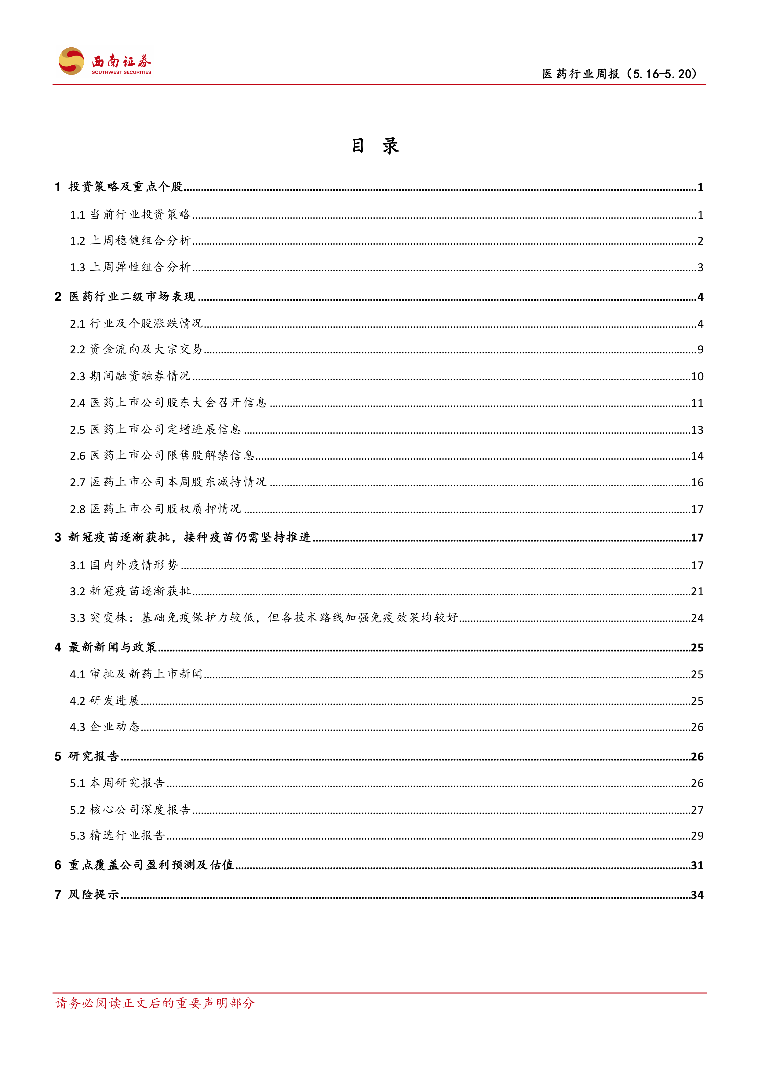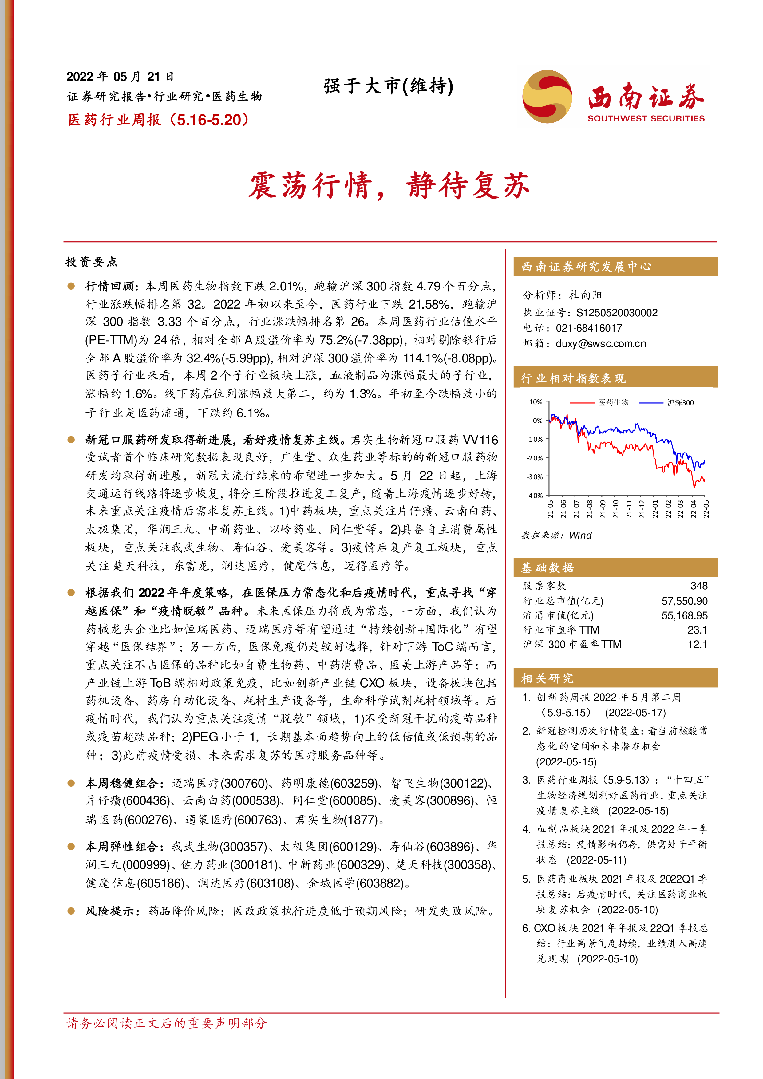 本报告对2022年5月16日至5月20日一周的医药行业进行了全面分析,涵盖了二级市场表现、新冠疫情形势、疫苗研发进展、最新新闻政策以及重点公司盈利预测等方面。报告指出,医药行业短期内面临挑战,但长期发展前景依然向好,建议投资者关注“穿越医保”和“疫情脱敏”品种,并根据自身风险偏好选择合适的投资组合。 报告中提供的详尽数据和分析,为投资者提供了重要的参考依据。 然而,投资者需注意报告中提到的风险提示,并自行承担投资风险。