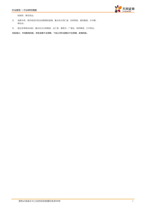 风险提示:市场震荡风险,研发进展不及预期,个别公司外延整合不及预期,疫情风险。