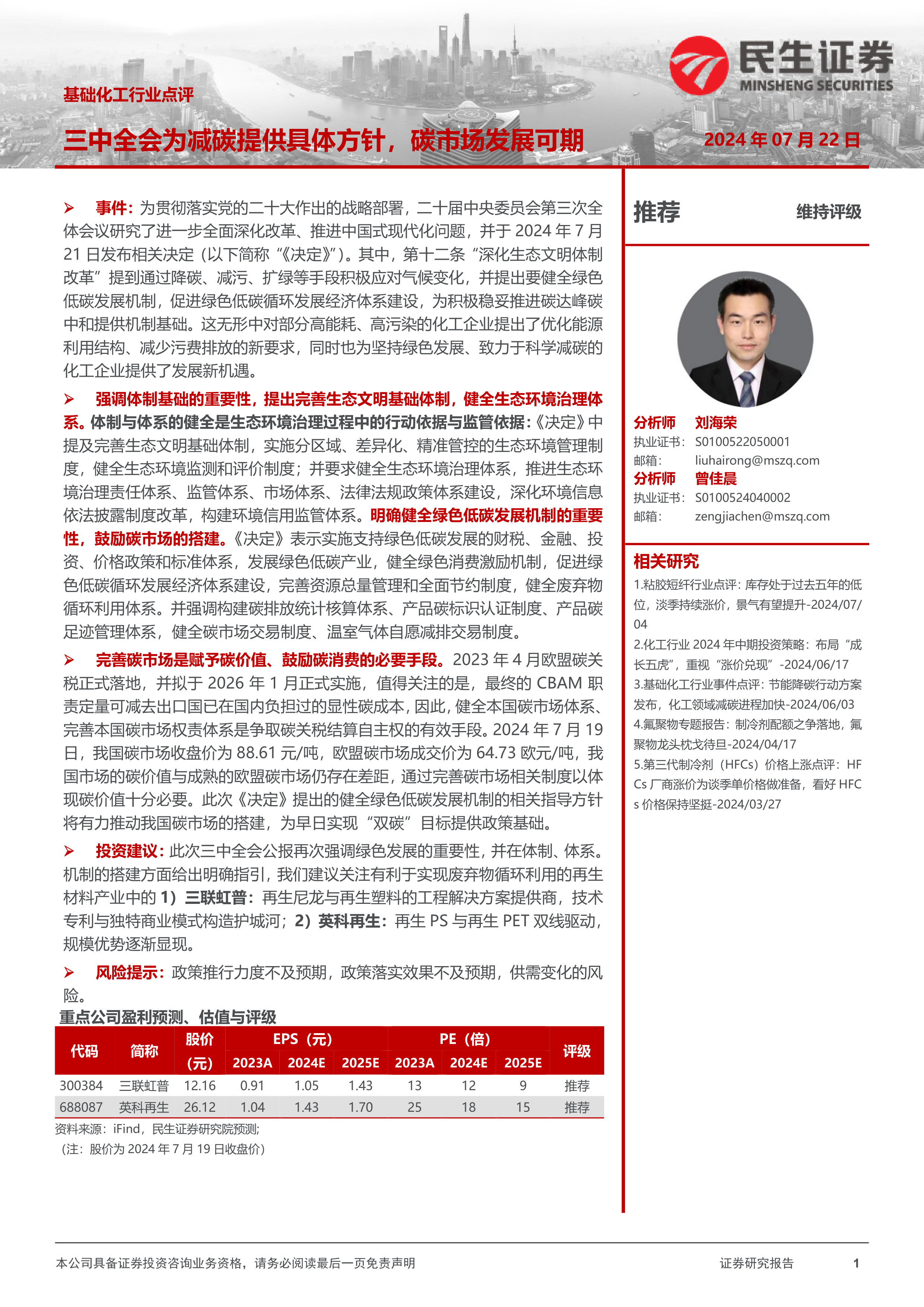 本报告分析了三中全会关于深化生态文明体制改革的决定对基础化工行业的影响,特别是对碳市场发展和绿色低碳发展的影响。 报告认为,该决定为我国碳市场建设提供了重要的政策支持,同时也对高能耗、高污染的化工企业提出了新的环保要求。 报告建议关注再生材料产业,并推荐了三联虹普和英科再生两家公司作为投资标的,同时提示了相关的投资风险。 报告基于公开信息,并包含了分析师的承诺和免责声明。 报告中提供的财务数据和评级仅供参考,不构成投资建议。