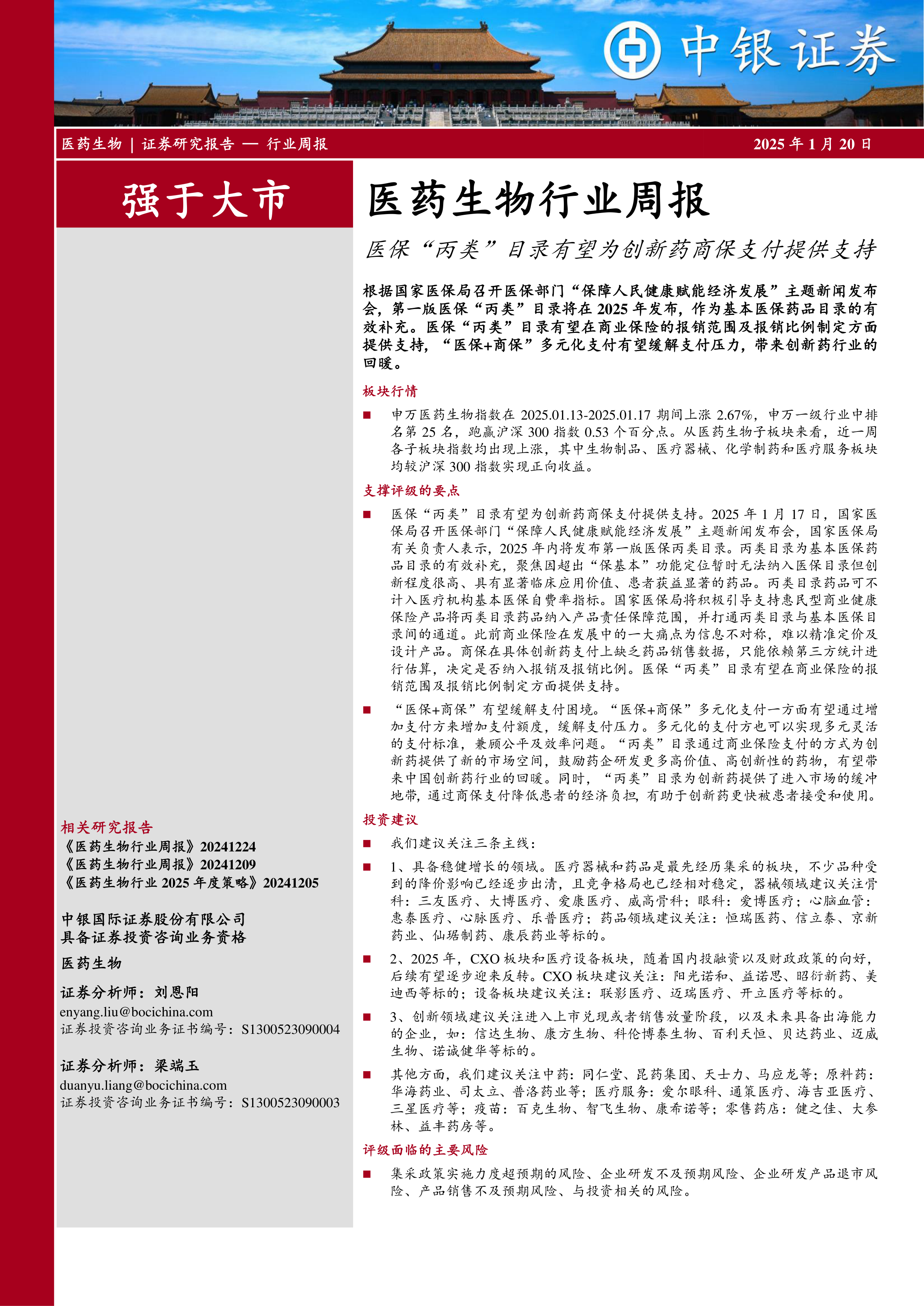 根据国家医保局召开医保部门“保障人民健康赋能经济发展”主题新闻发布会,第一版医保“丙类”目录将在2025年发布,作为基本医保药品目录的有效补充。医保“丙类”目录有望在商业保险的报销范围及报销比例制定方面提供支持,“医保+商保”多元化支付有望缓解支付压力,带来创新药行业的回暖。