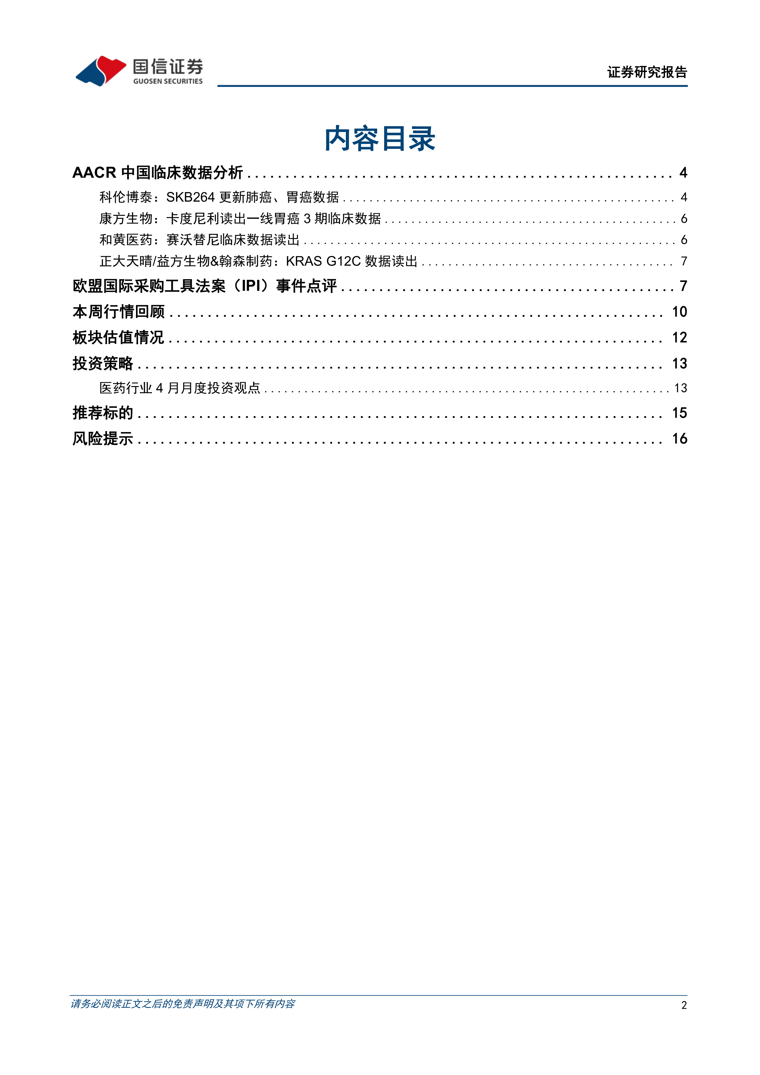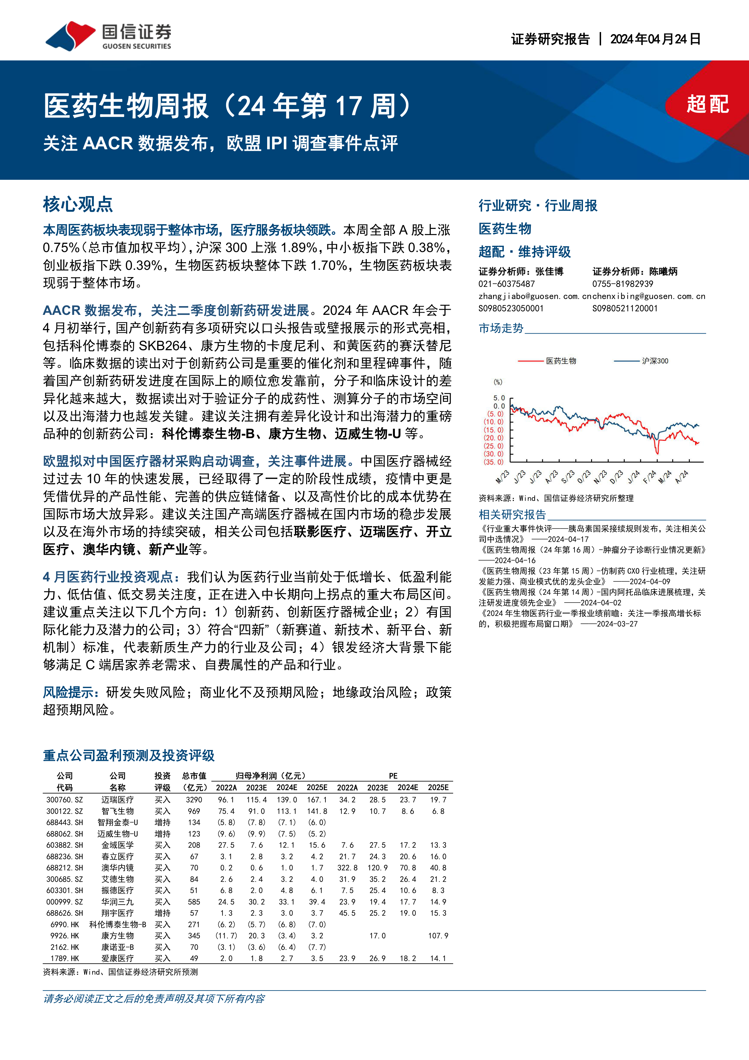 本报告的核心观点是:医药行业正处于低增长、低盈利、低估值、低关注度的阶段,但正处于中长期向上拐点的重大布局区间。建议关注以下几个方向:创新药及创新医疗器械企业;具备国际化能力和潜力的公司;符合“四新”标准的企业;以及满足C端居家养老需求的企业。本周医药板块表现弱于整体市场,但AACR年会国产创新药数据发布以及欧盟对中国医疗器械采购启动调查等事件值得关注。