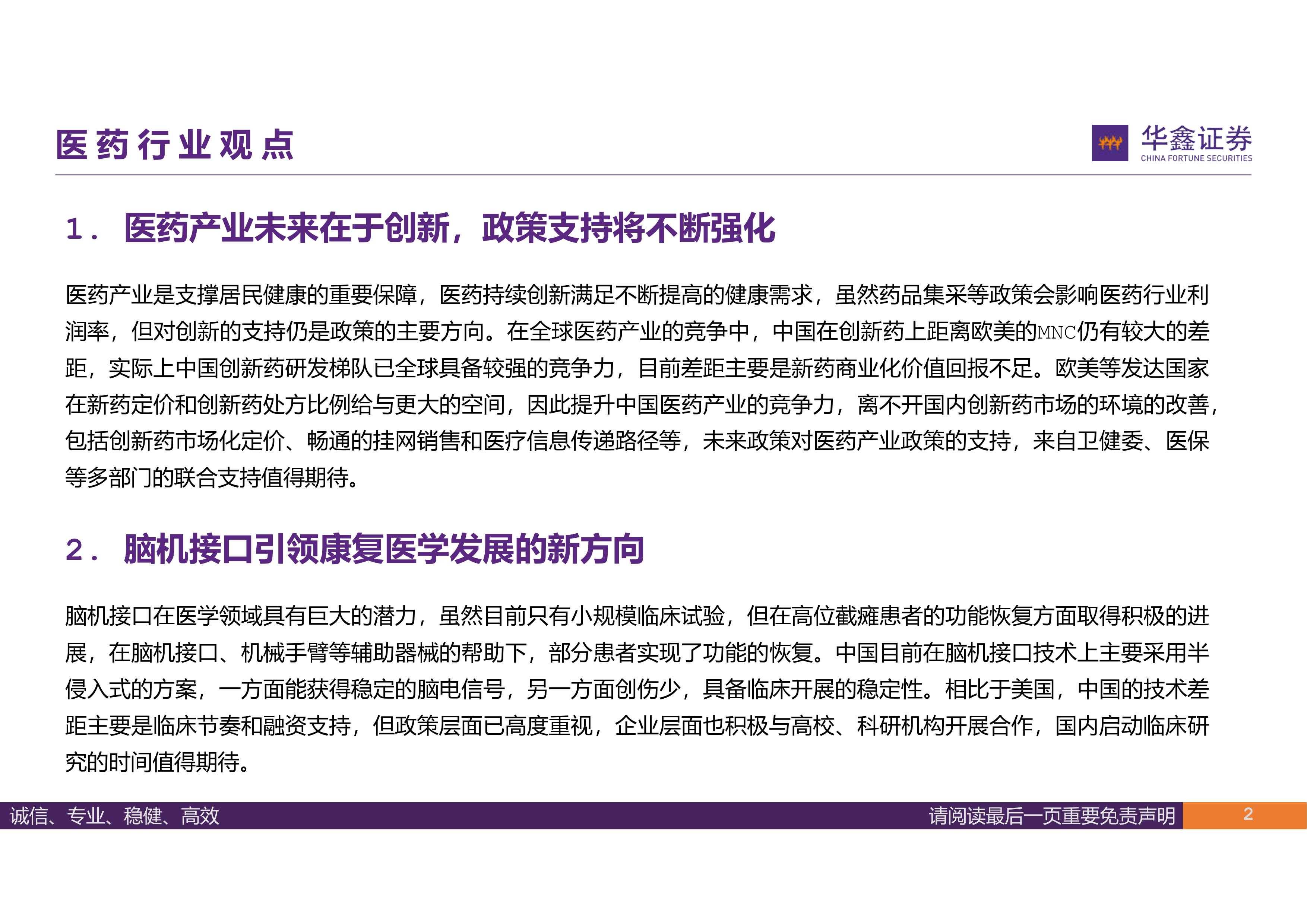 本报告对医药行业进行了全面的分析,指出政策持续支持医药创新,创新药市场有望改善,并重点关注了脑机接口、呼吸道快检、GLP-1RA等多个细分领域的投资机会。报告推荐的股票涵盖了行业多个细分领域,并提供了相应的盈利预测和估值分析,但同时也提示了行业面临的风险。投资者应根据自身情况谨慎投资。 报告数据主要来源于Wind和华鑫证券研究所,部分数据来自公开信息,力求准确可靠,但不能保证其准确性和完整性。 投资者应独立评估报告信息,并结合自身情况做出投资决策。
