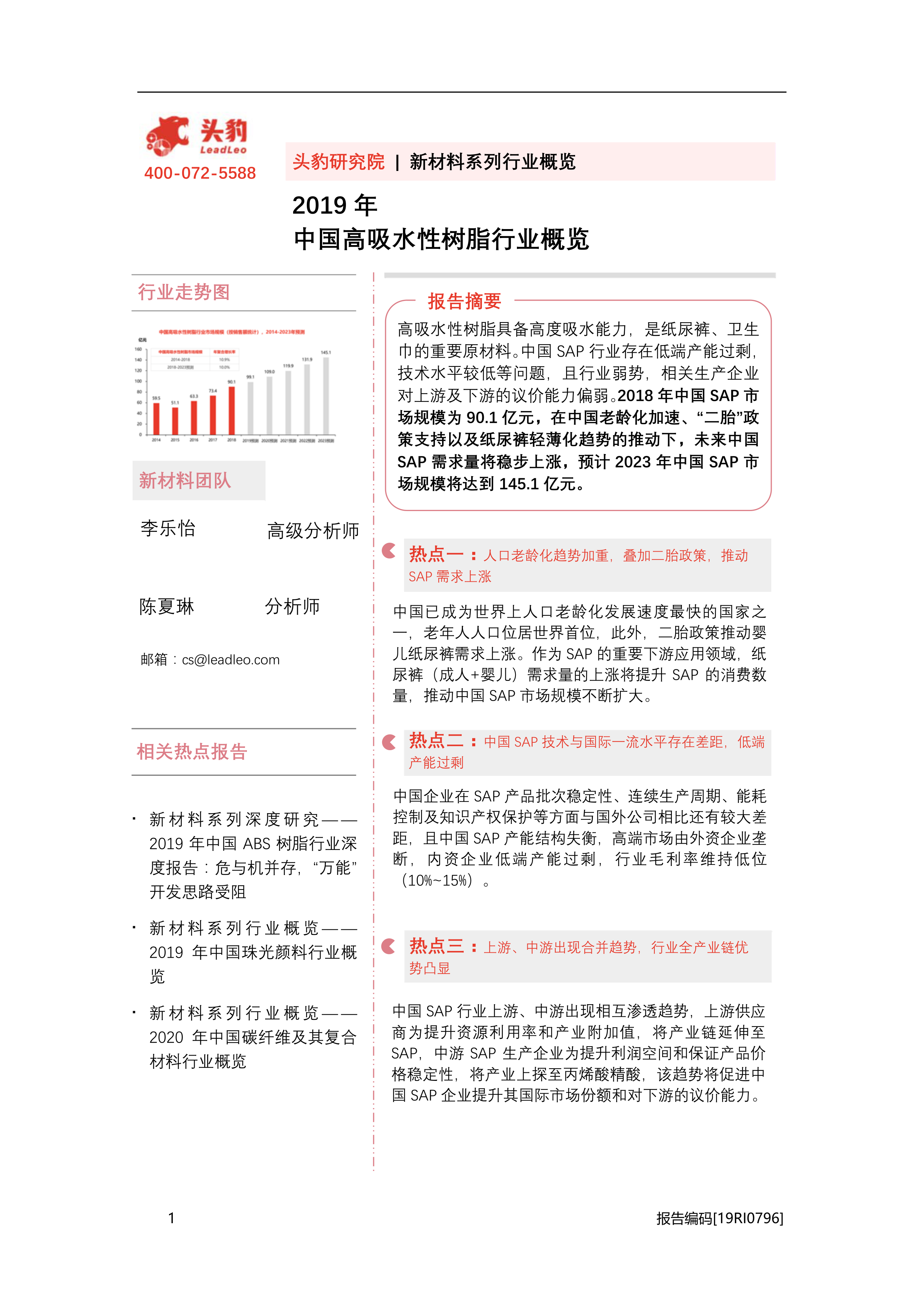 本报告的核心观点是:中国高吸水性树脂(SAP)行业市场规模持续增长,预计2023年将达到145.1亿元,主要驱动力是人口老龄化加剧导致成人纸尿裤需求上涨、二胎政策及婴儿纸尿裤轻薄化趋势推动婴儿纸尿裤需求增长,以及出口具备相对优势。然而,行业也面临着低端产能过剩、技术与国际一流水平存在差距等挑战。未来,行业发展趋势将呈现上游、中游合并趋势,以及SAP产品高性能化、复合化、功能化发展趋势。