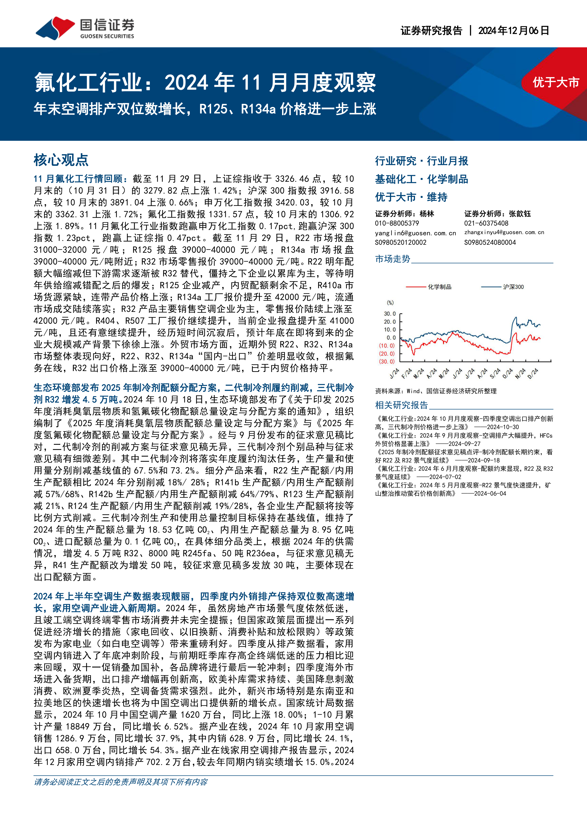 本报告的核心观点是:2024年11月氟化工行业整体表现优于大市,主要得益于年末空调排产的双位数增长,以及R125、R134a等制冷剂价格的进一步上涨。2025年制冷剂配额方案的发布,二代制冷剂履约削减,三代制冷剂R32增发,将进一步影响市场供需格局,长期来看,R22、R32等制冷剂景气度将延续,价格仍有较大上行空间。建议关注产业链完整、基础设施配套齐全、制冷剂配额领先以及工艺技术先进的氟化工龙头企业。
