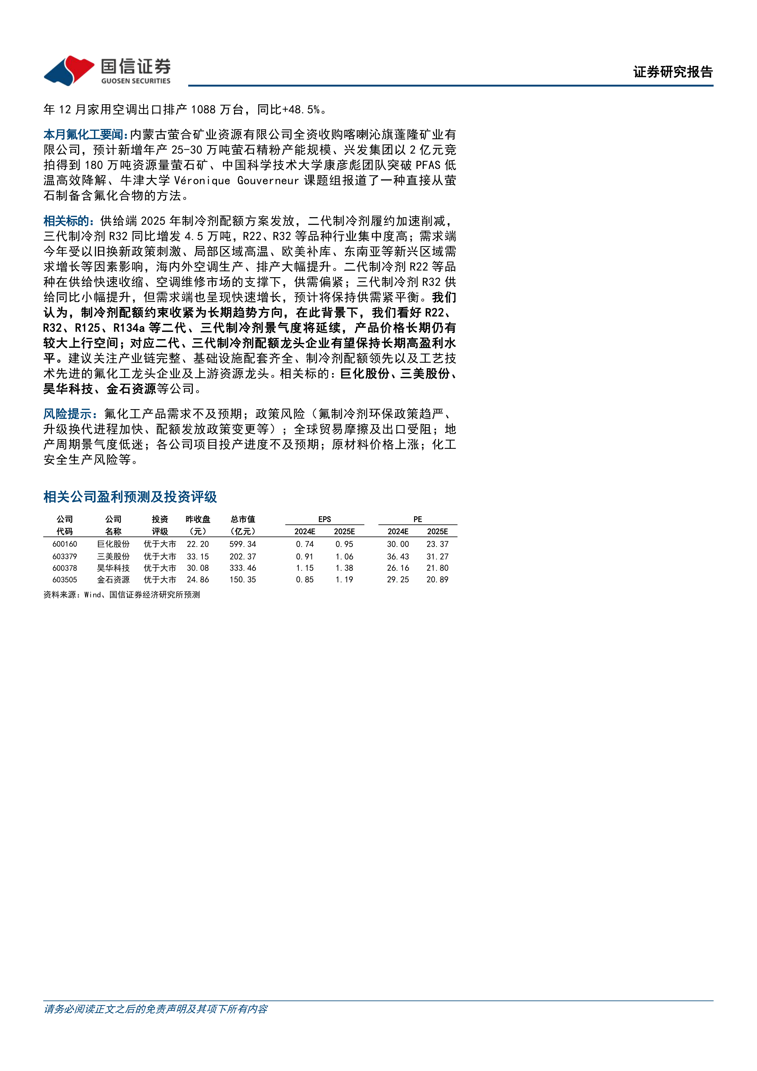 本报告通过对11月份氟化工行业数据的分析,以及对2025年制冷剂配额方案的解读,得出结论:氟化工行业整体表现优于大市,主要制冷剂价格上涨,空调等下游行业需求旺盛,推动了行业增长。2025年配额方案的实施将进一步影响市场供需格局,长期来看,部分制冷剂景气度将延续,价格仍有较大上行空间。投资者应关注相关龙头企业,但需注意行业面临的需求不及预期、政策风险、贸易摩擦等风险。