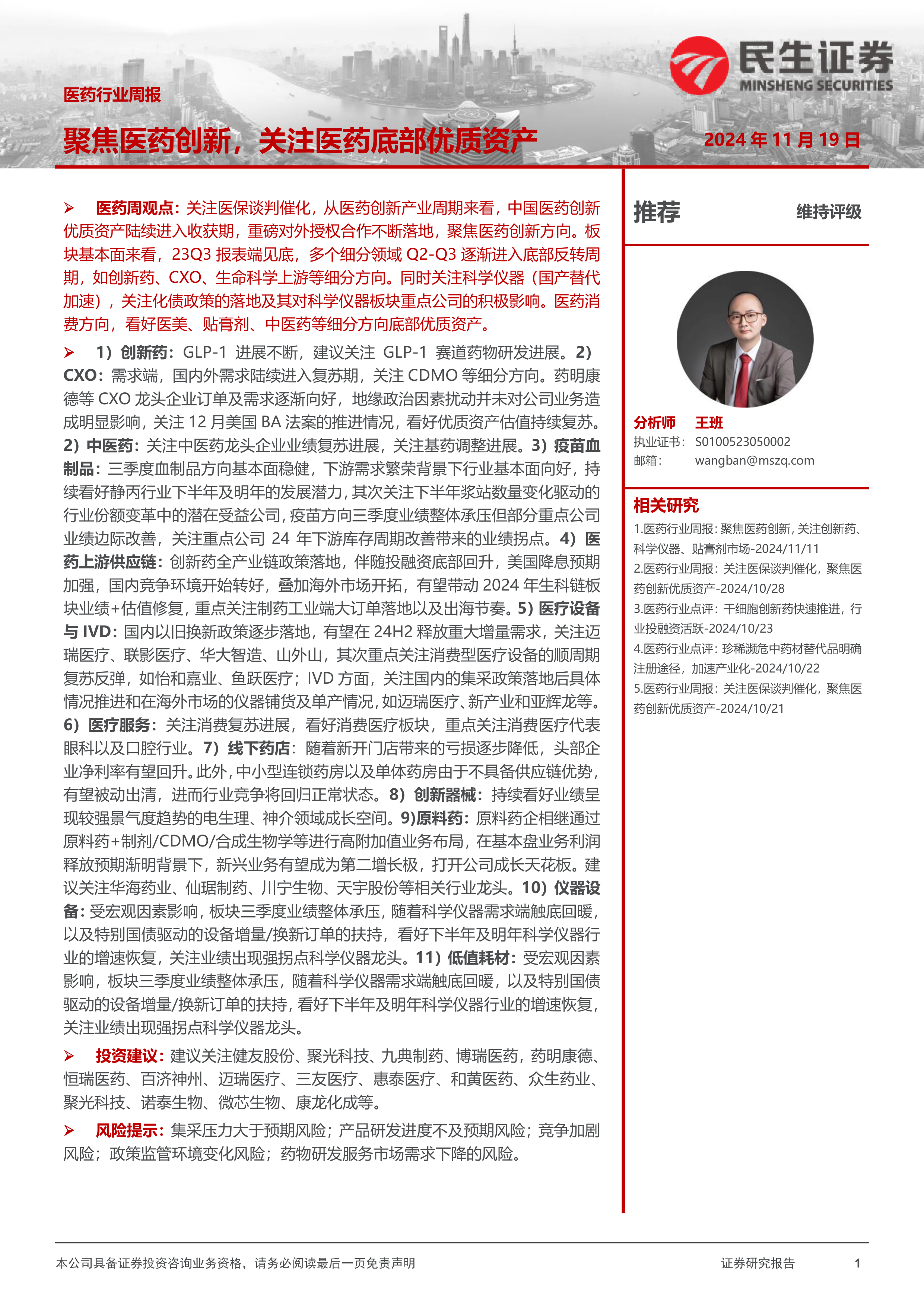 风险提示:集采压力大于预期风险;产品研发进度不及预期风险;竞争加剧风险;政策监管环境变化风险;药物研发服务市场需求下降的风险。