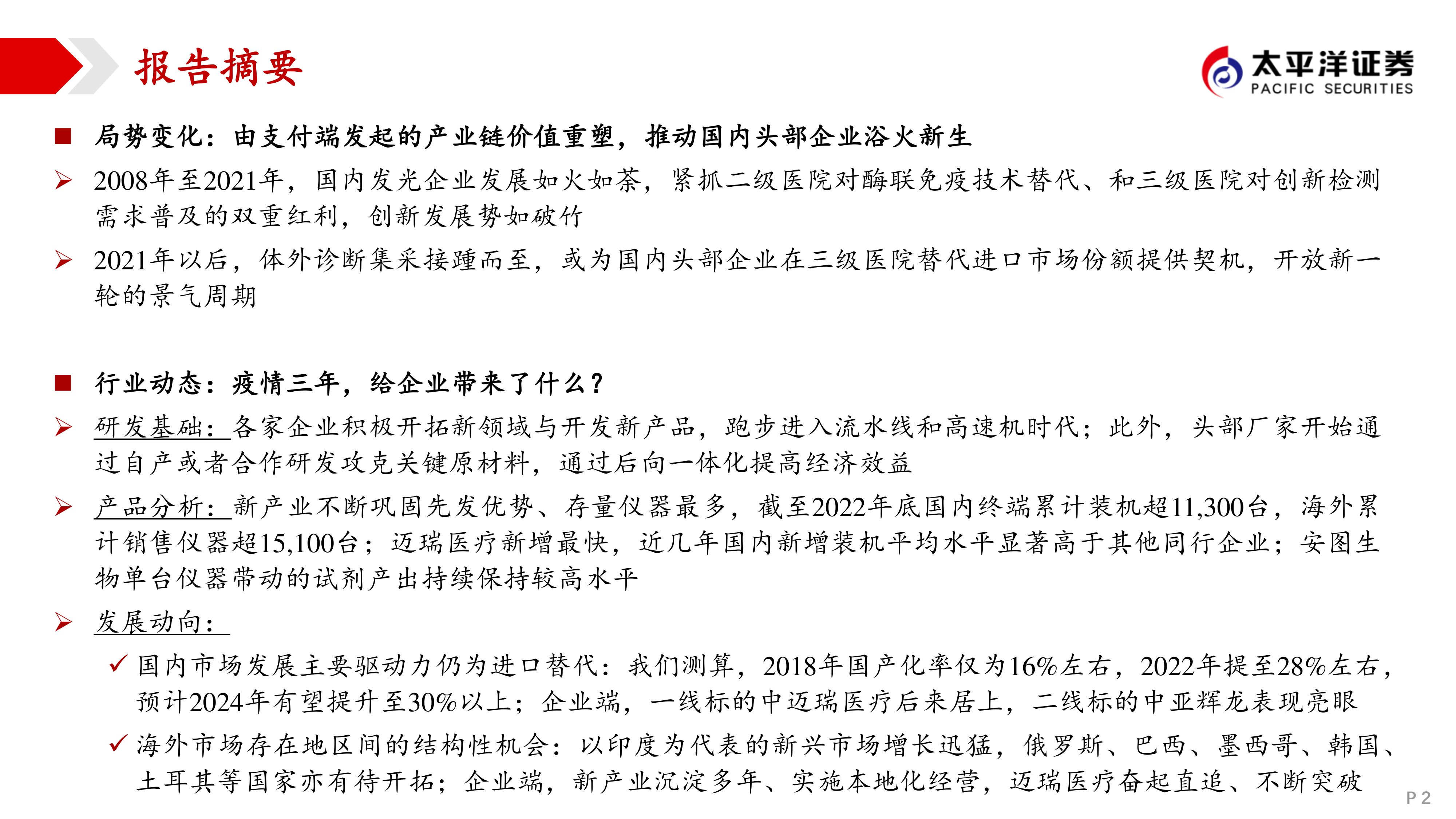 国内市场发展主要驱动力仍为进口替代:我们测算,2018年国产化率仅为16%左右,2022年提至28%左右,预计2024年有望提升至30%以上;企业端,一线标的中迈瑞医疗后来居上,二线标的中亚辉龙表现亮眼