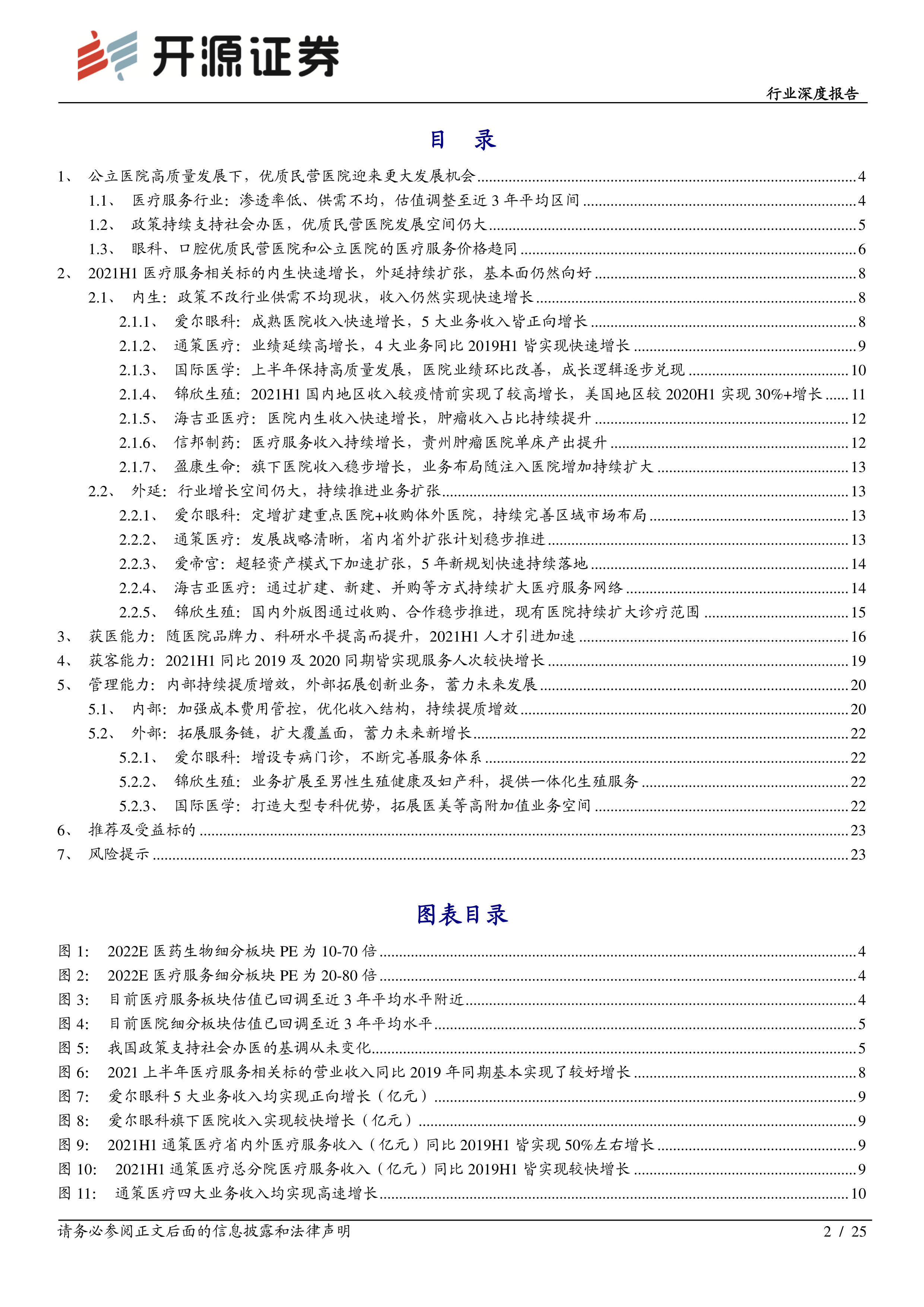 2021H1 医疗服务相关标的内生快速增长,外延持续扩张,基本面仍然向好汇总发现, 2021 上半年医疗服务相关标的基本面仍然向好。从内生来看,政策不改行业供需不均现状,2021H1 收入实现快速增长;从外延来看,各民营医疗服务机构持续推进业务扩张,行业增长空间仍大。从获医能力来看,2021H1 民营医疗机构加速引入优质医生,且加速人才培养进程,持续扩充医疗团队。 从获客能力来看,2021H1 大多民营医疗机构服务人次实现了快速增长。从管理能力来看,大多民营医疗机构实现了毛利率提升、同时管理/财务费用率下降,成本费用管控能力加强; 在服务链拓展方面,爱尔眼科增设专病门诊,锦欣生殖扩展男科与产科服务,国际医学拓展医美、康复等高附加值业务空间。此外,民营医疗机构还通过优化自身收入结构增强其核心竞争力。
