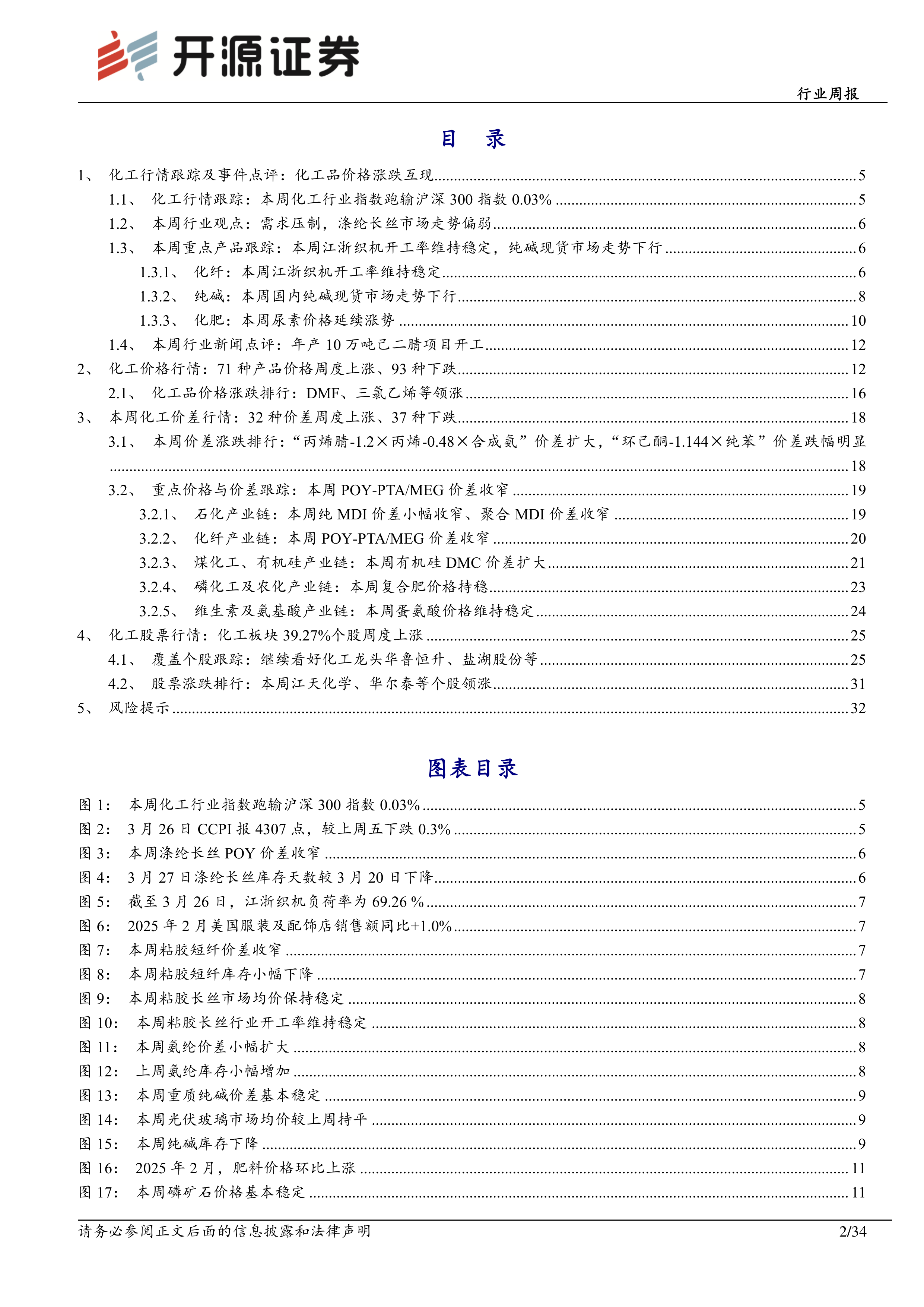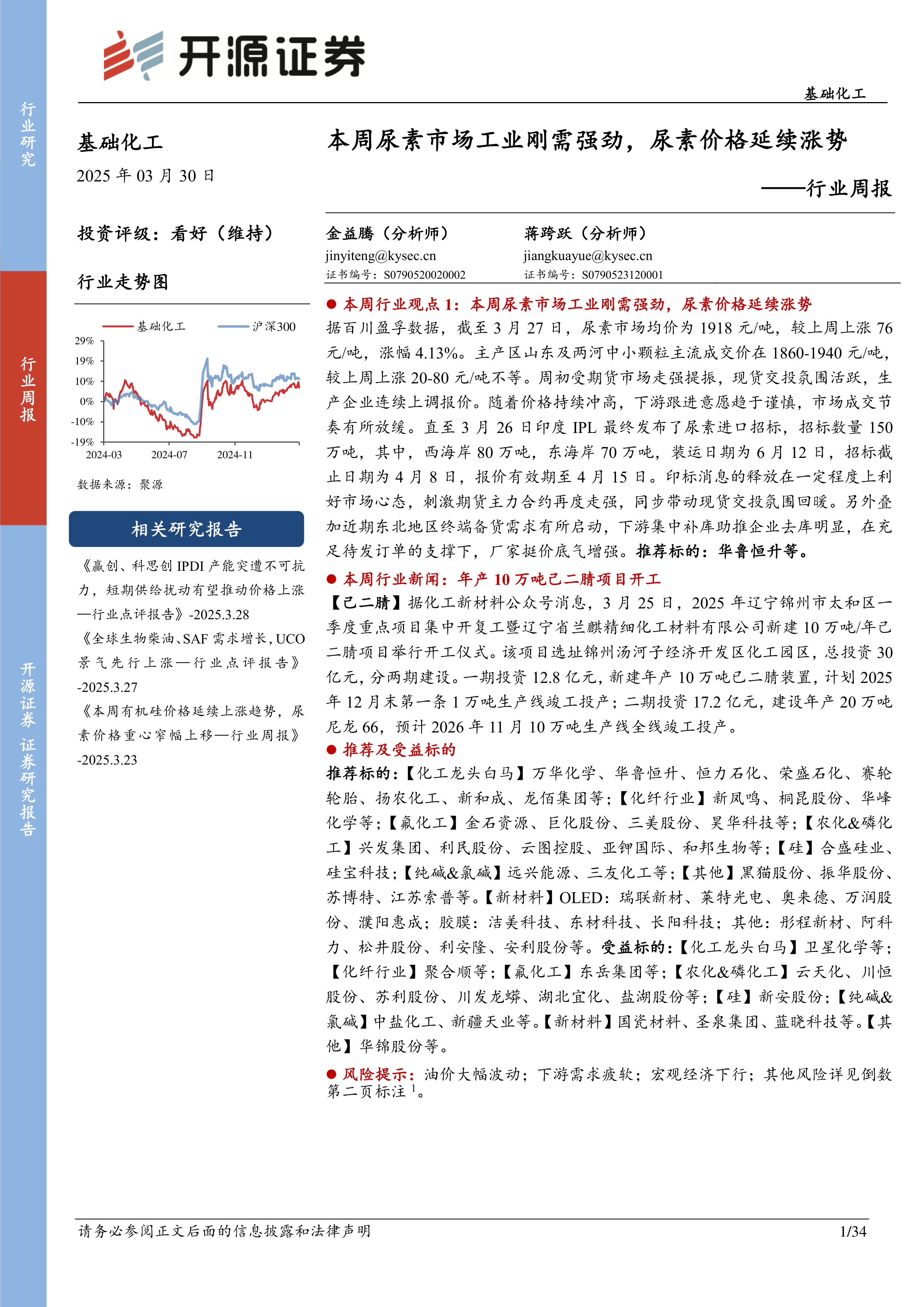 本报告的核心观点是:本周基础化工行业整体表现弱于沪深300指数,化工品价格涨跌互现。尿素市场因工业刚需强劲和印度进口招标消息提振而价格上涨;涤纶长丝市场则因下游需求疲软而价格下跌;纯碱市场供大于求,价格下行。部分化工产品价差扩大,部分收窄。化工板块个股涨跌分化,部分龙头企业表现相对稳健。