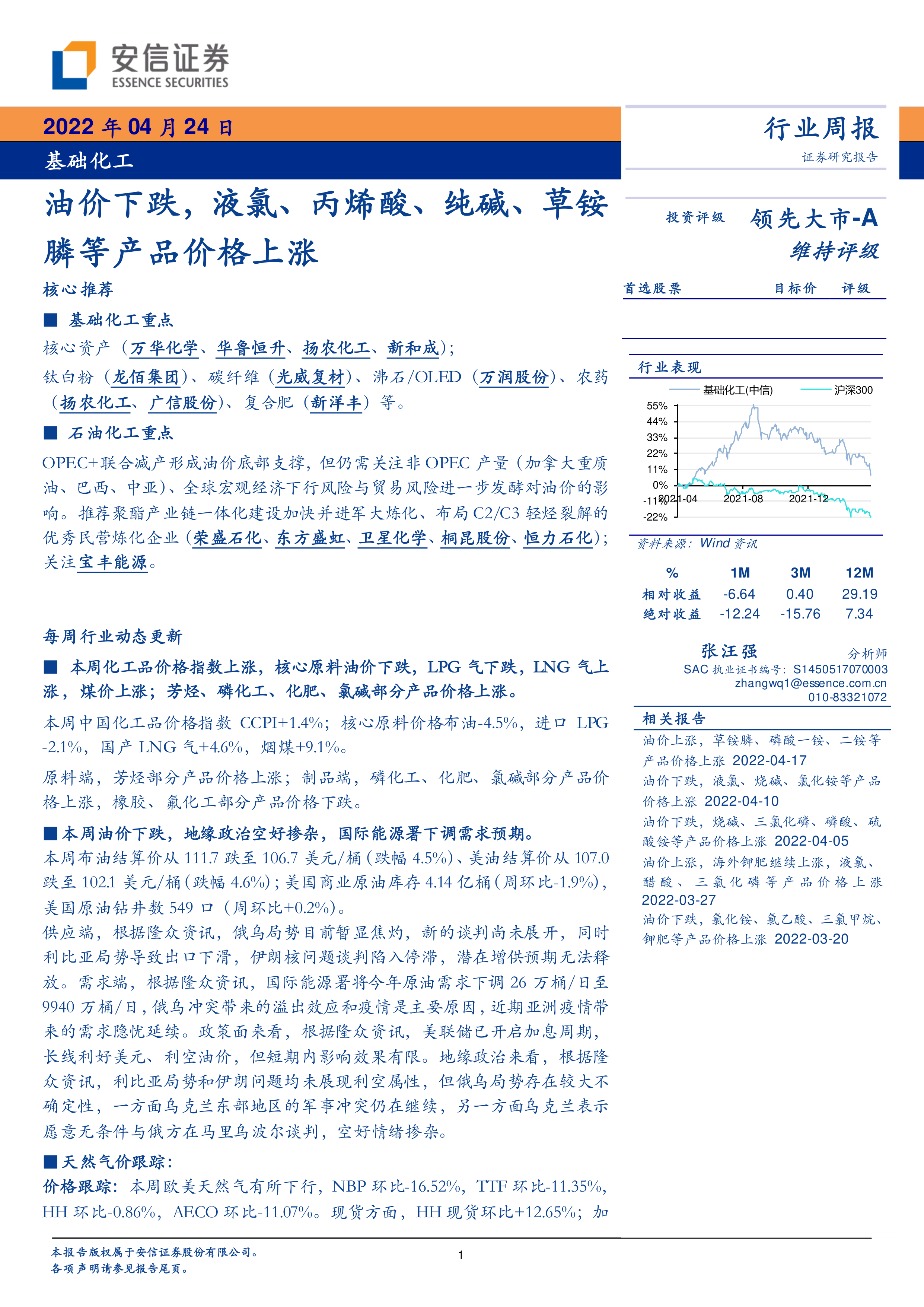 基础化工行业周报:油价下跌,液氯、丙烯酸、纯碱、草铵膦等产品价格上涨