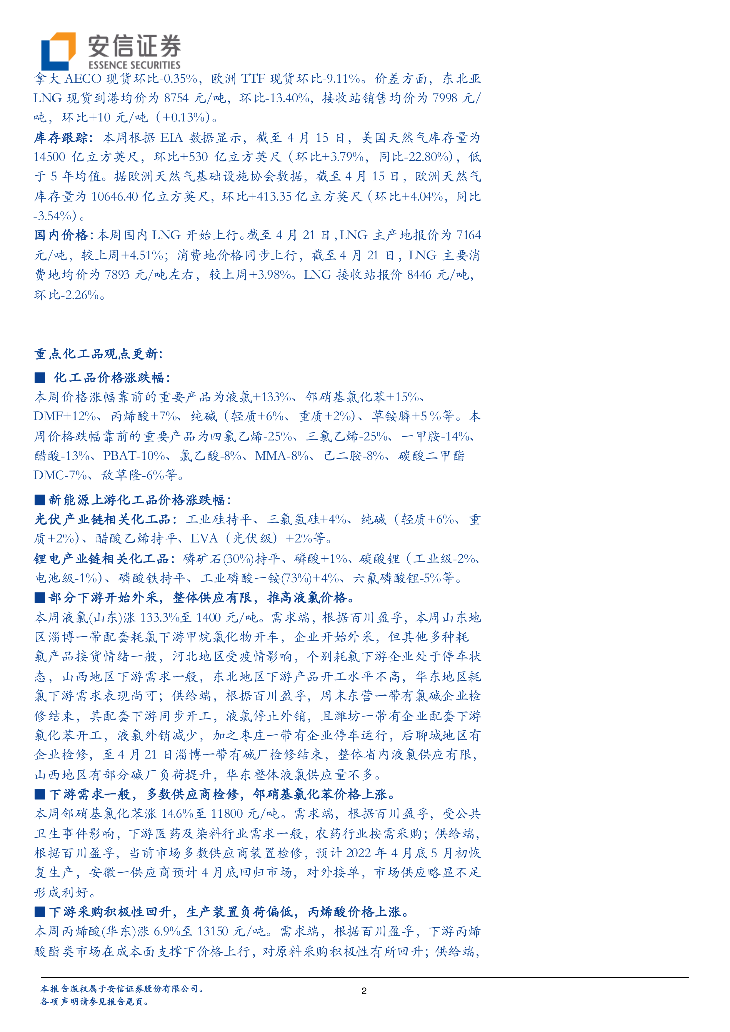 报告还跟踪了国内外天然气价格和库存的变化情况,包括欧美天然气价格、国内LNG价格以及美国和欧洲天然气库存量等数据。