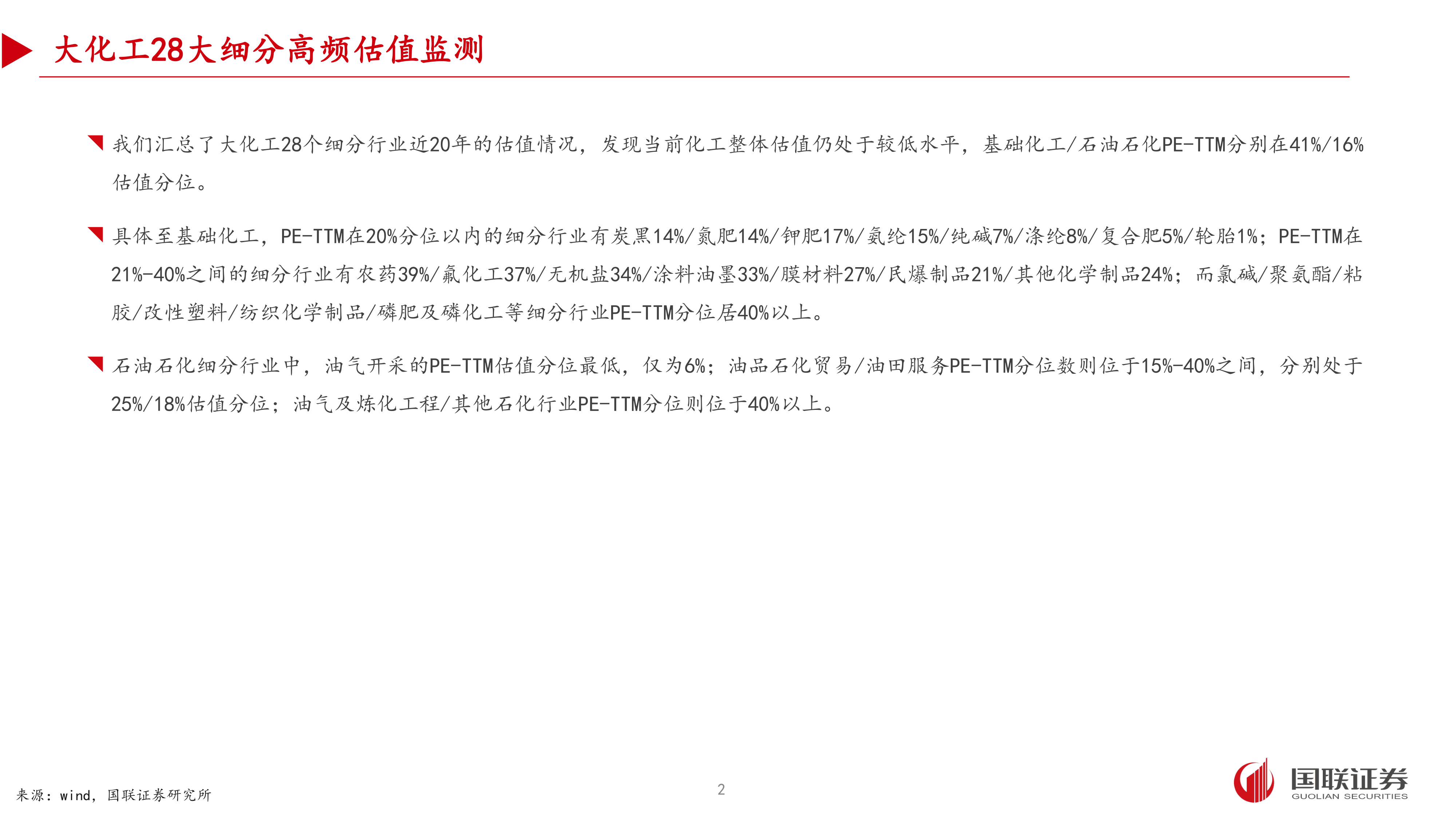 本报告对大化工28个细分行业进行了高频估值监测,并对基础化工和石油石化行业进行了详细分析。