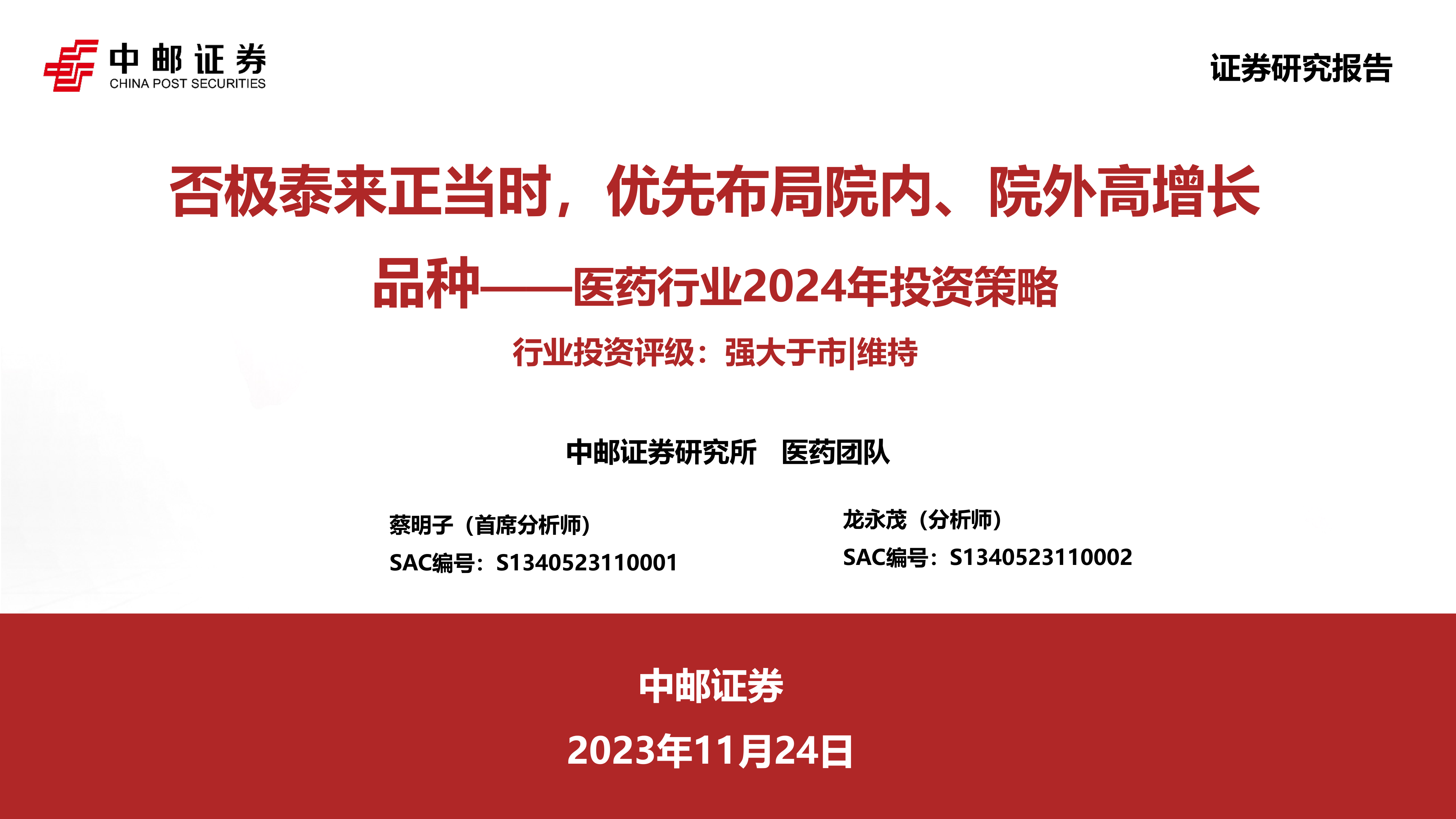 医药行业2024年投资策略:否极泰来正当时,优先布局院内、院外高增长品种
