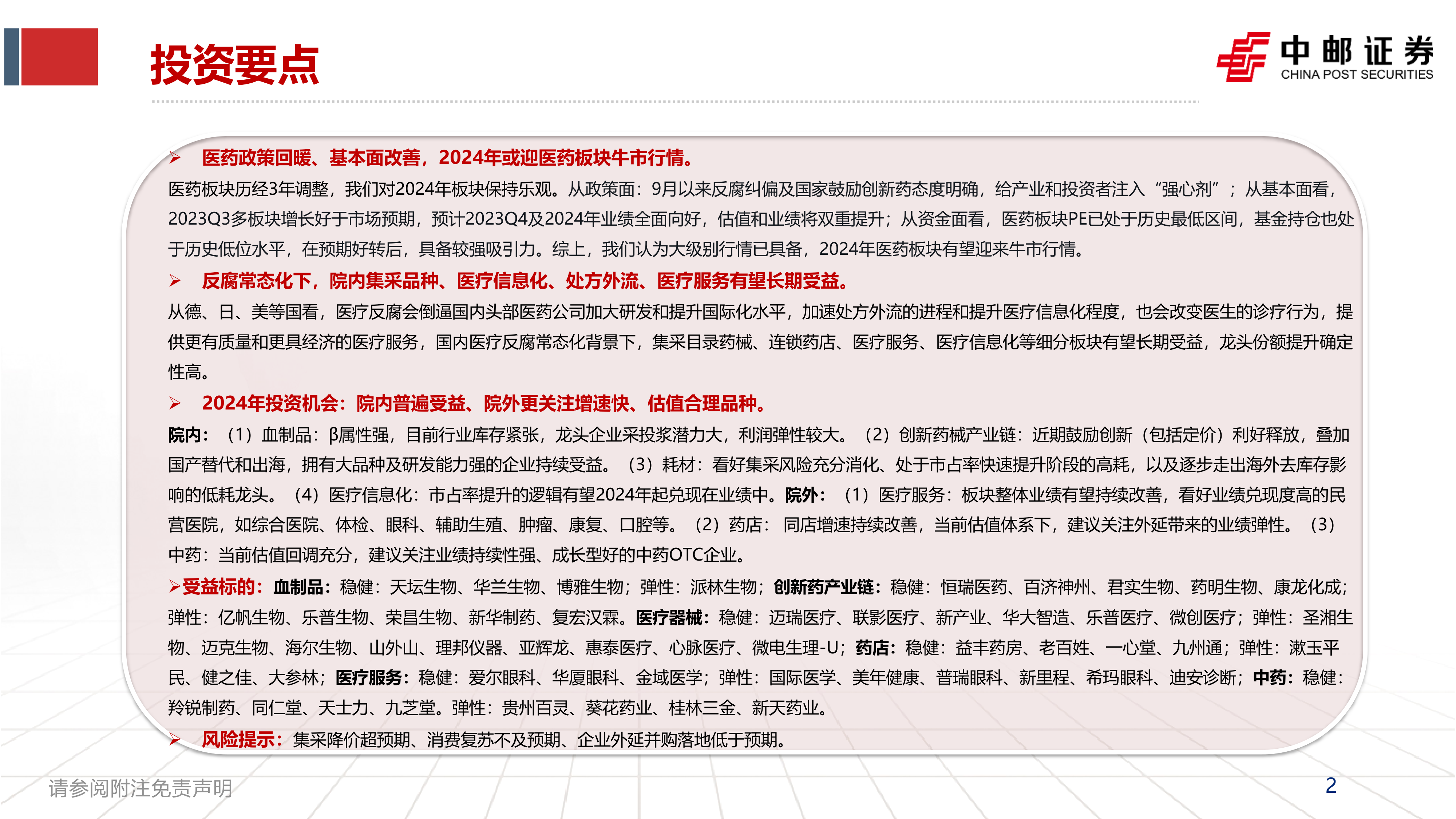 2024年投资机会:院内普遍受益、院外更关注增速快、估值合理品种。院内:(1)血制品:β属性强,目前行业库存紧张,龙头企业采投浆潜力大,利润弹性较大。(2)创新药械产业链:近期鼓励创新(包括定价)利好释放,叠加国产替代和出海,拥有大品种及研发能力强的企业持续受益。(3)耗材:看好集采风险充分消化、处于市占率快速提升阶段的高耗,以及逐步走出海外去库存影响的低耗龙头。(4)医疗信息化:市占率提升的逻辑有望2024年起兑现在业绩中。院外:(1)医疗服务:板块整体业绩有望持续改善,看好业绩兑现度高的民营医院,如综合医院、体检、眼科、辅助生殖、肿瘤、康复、口腔等。(2)药店:同店增速持续改善,当前估值体系下,建议关注外延带来的业绩弹性。(3)中药:当前估值回调充分,建议关注业绩持续性强、成长型好的中药OTC企业。