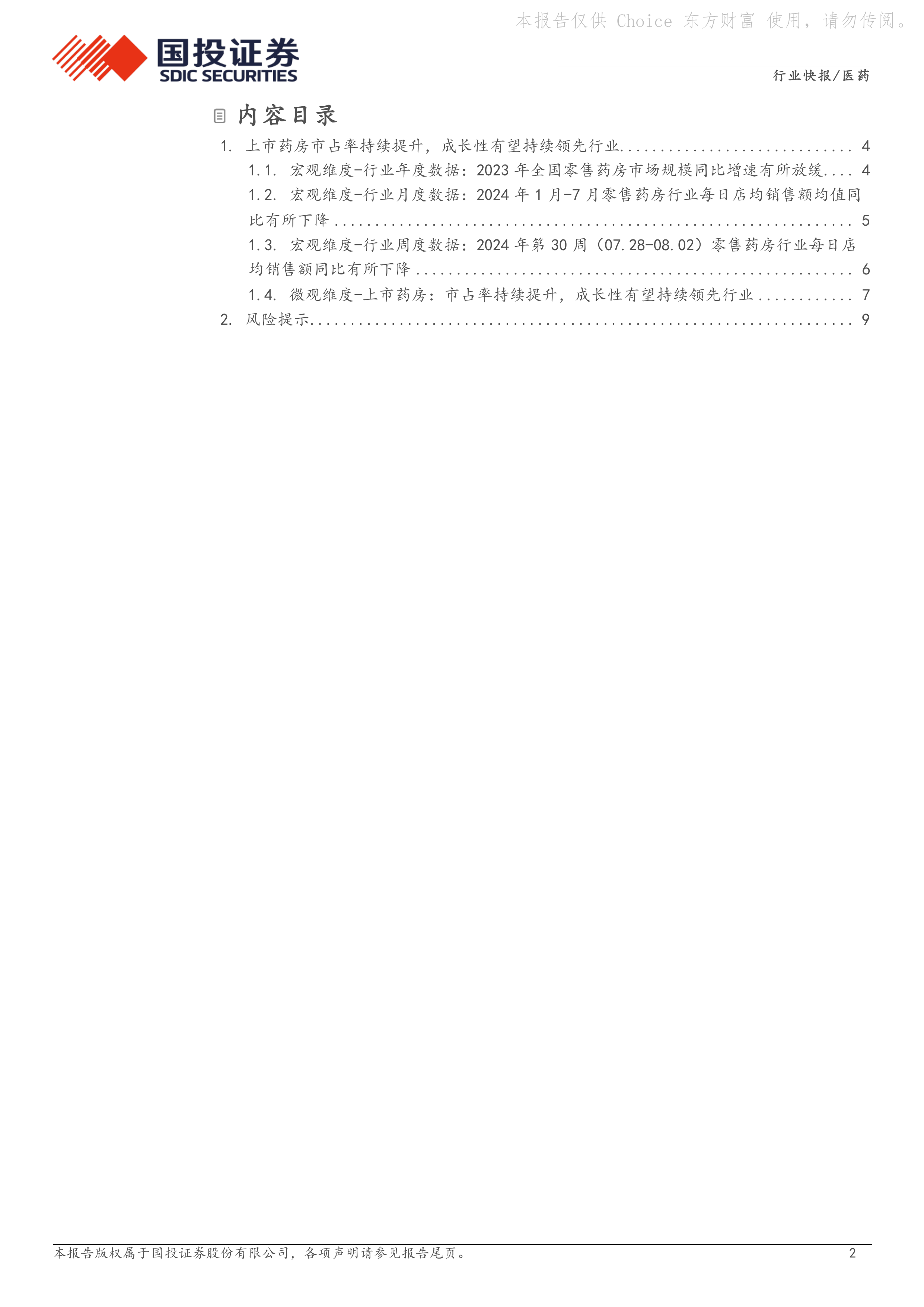 本报告的核心观点是:尽管2024年1月-7月中国零售药房行业每日店均销售额同比下降,但上市药房市占率持续提升,成长性有望领先行业。这主要源于行业集中度低,龙头企业具备扩张能力和精细化管理能力,能够通过快速扩张推动行业整合,从而获得高于行业平均水平的增长。报告同时指出了行业面临的风险,例如医药新零售冲击、跨区域扩张风险、行业竞争加剧、药品降价以及处方外流低于预期等。