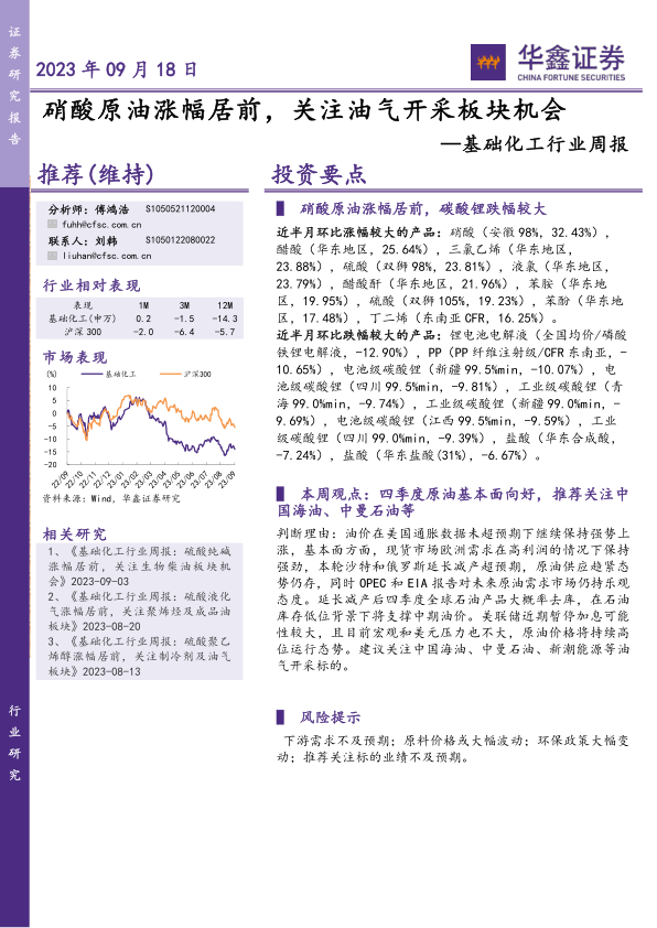 基础化工行业周报:硝酸原油涨幅居前,关注油气开采板块机会