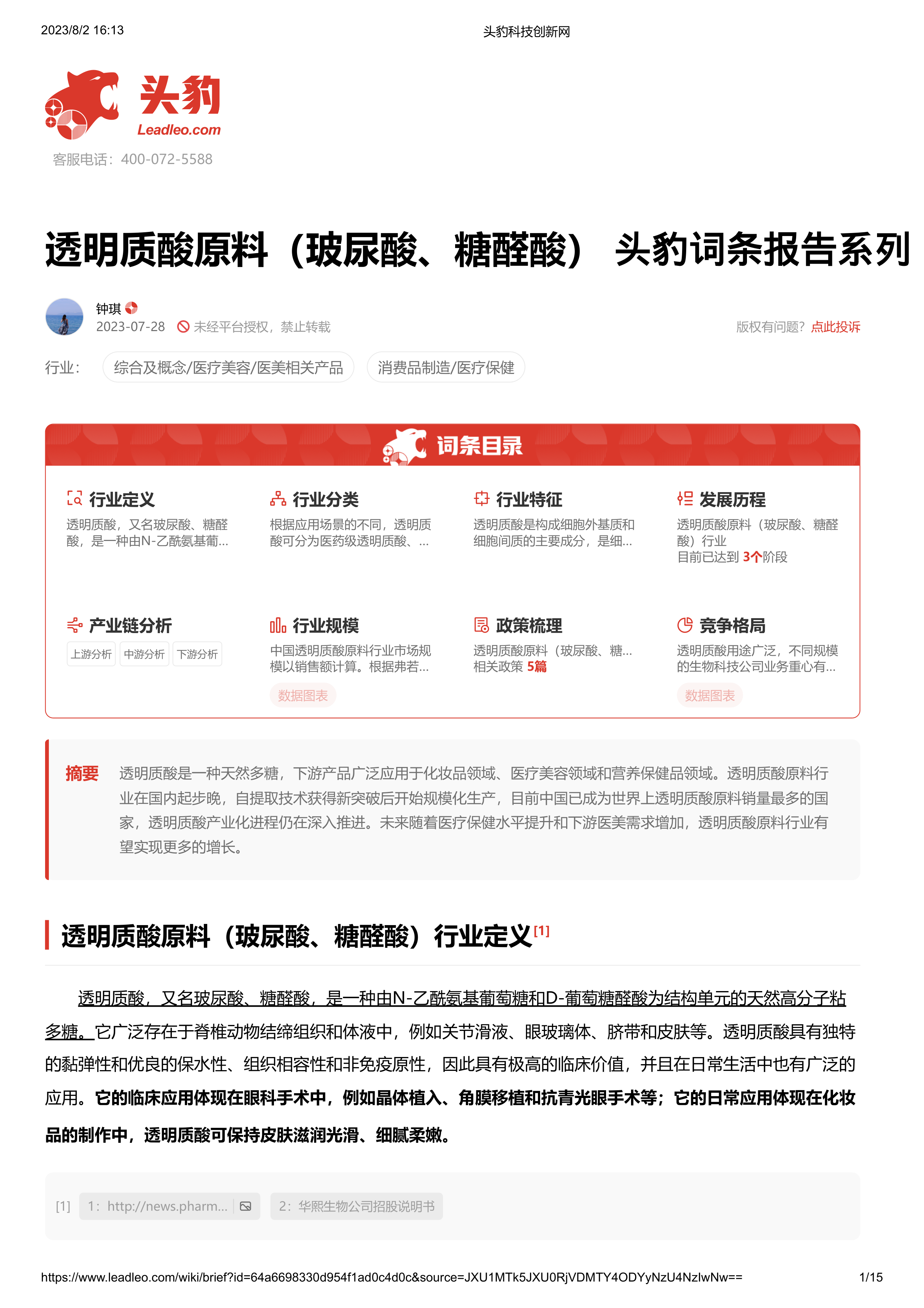 透明质酸原料(玻尿酸、糖醛酸) 头豹词条报告系列