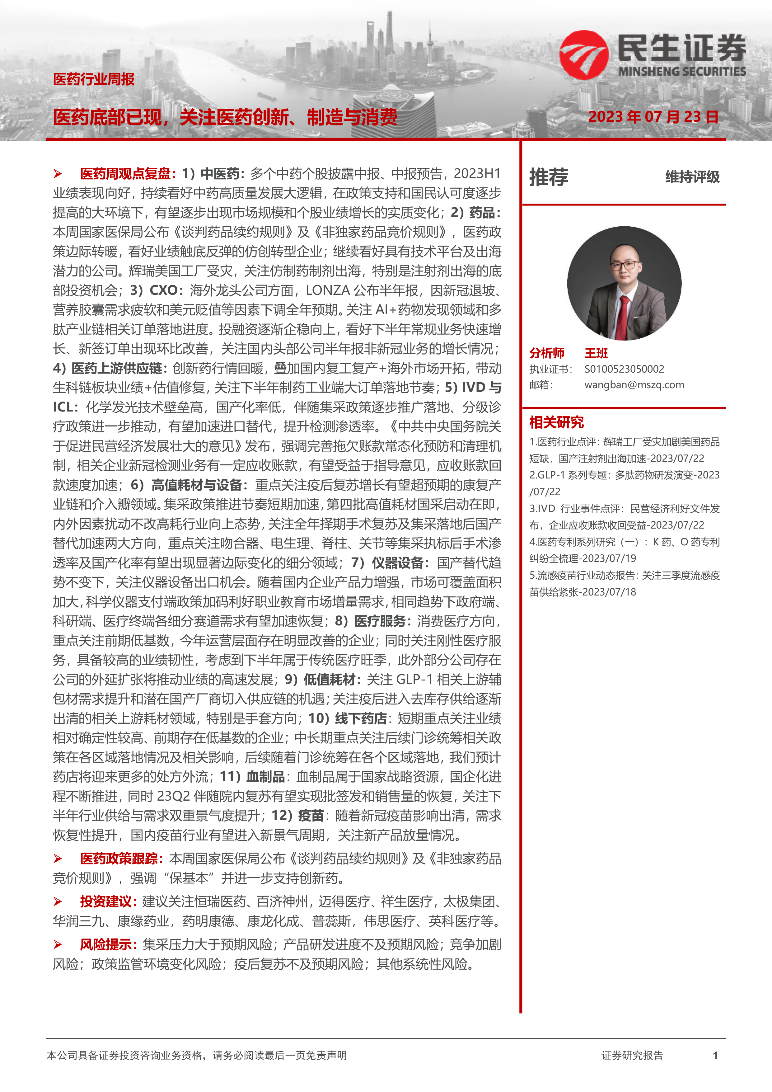 医药周观点复盘: 1)中医药: 多个中药个股披露中报、中报预告, 2023H1业绩表现向好,持续看好中药高质量发展大逻辑,在政策支持和国民认可度逐步提高的大环境下,有望逐步出现市场规模和个股业绩增长的实质变化; 2) 药品:本周国家医保局公布《谈判药品续约规则》及《非独家药品竞价规则》 , 医药政策边际转暖,看好业绩触底反弹的仿创转型企业; 继续看好具有技术平台及出海潜力的公司。辉瑞美国工厂受灾, 关注仿制药制剂出海,特别是注射剂出海的底部投资机会; 3) CXO: 海外龙头公司方面, LONZA 公布半年报,因新冠退坡、营养胶囊需求疲软和美元贬值等因素下调全年预期。 关注 AI+药物发现领域和多肽产业链相关订单落地进度。 投融资逐渐企稳向上,看好下半年常规业务快速增长、新签订单出现环比改善, 关注国内头部公司半年报非新冠业务的增长情况;4)医药上游供应链: 创新药行情回暖,叠加国内复工复产+海外市场开拓,带动生科链板块业绩+估值修复,关注下半年制药工业端大订单落地节奏; 5) IVD 与ICL: 化学发光技术壁垒高,国产化率低,伴随集采政策逐步推广落地、分级诊疗政策进一步推动,有望加速进口替代,提升检测渗透率。 《中共中央国务院关于促进民营经济发展壮大的意见》发布,强调完善拖欠账款常态化预防和清理机制,相关企业新冠检测业务有一定应收账款,有望受益于指导意见,应收账款回款速度加速; 6)高值耗材与设备: 重点关注疫后复苏增长有望超预期的康复产业链和介入瓣领域。 集采政策推进节奏短期加速,第四批高值耗材国采启动在即,内外因素扰动不改高耗行业向上态势,关注全年择期手术复苏及集采落地后国产替代加速两大方向,重点关注吻合器、电生理、脊柱、关节等集采执标后手术渗透率及国产化率有望出现显著边际变化的细分领域; 7)仪器设备: 国产替代趋势不变下,关注仪器设备出口机会。随着国内企业产品力增强,市场可覆盖面积加大,科学仪器支付端政策加码利好职业教育市场增量需求,相同趋势下政府端、科研端、医疗终端各细分赛道需求有望加速恢复; 8)医疗服务: 消费医疗方向,重点关注前期低基数,今年运营层面存在明显改善的企业;同时关注刚性医疗服务,具备较高的业绩韧性,考虑到下半年属于传统医疗旺季,此外部分公司存在公司的外延扩张将推动业绩的高速发展; 9)低值耗材: 关注 GLP-1 相关上游辅包材需求提升和潜在国产厂商切入供应链的机遇;关注疫后进入去库存供给逐渐出清的相关上游耗材领域,特别是手套方向; 10)线下药店:短期重点关注业绩相对确定性较高、 前期存在低基数的企业;中长期重点关注后续门诊统筹相关政策在各区域落地情况及相关影响,后续随着门诊统筹在各个区域落地,我们预计药店将迎来更多的处方外流; 11)血制品:血制品属于国家战略资源,国企化进程不断推进,同时 23Q2 伴随院内复苏有望实现批签发和销售量的恢复,关注下半年行业供给与需求双重景气度提升; 12)疫苗:随着新冠疫苗影响出清,需求恢复性提升,国内疫苗行业有望进入新景气周期,关注新产品放量情况。