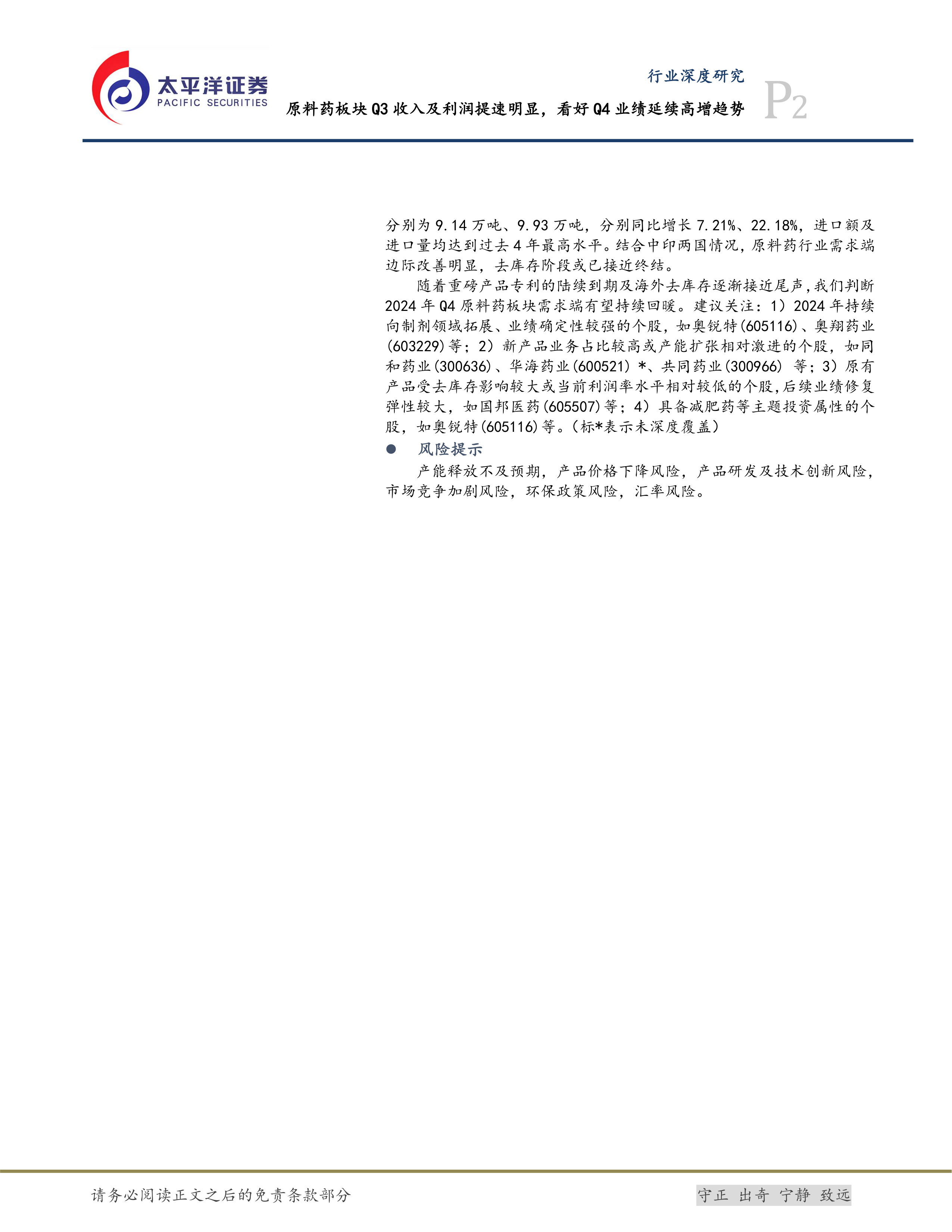 尽管Q3原料药板块估值有所上修,但仍处于历史低位,这与2023年以来行业竞争加剧和产品价格下降的压力有关。报告对板块TOP10企业进行了分析,发现少数公司贡献了大部分营收和利润,其中大宗原料药生产商占据主导地位。此外,报告还对奥锐特、奥翔药业、同和药业、共同药业和国邦医药等重点公司进行了深入分析,评估了其各自的业务模式、发展战略、业绩表现以及未来增长潜力,并给出了相应的投资建议。