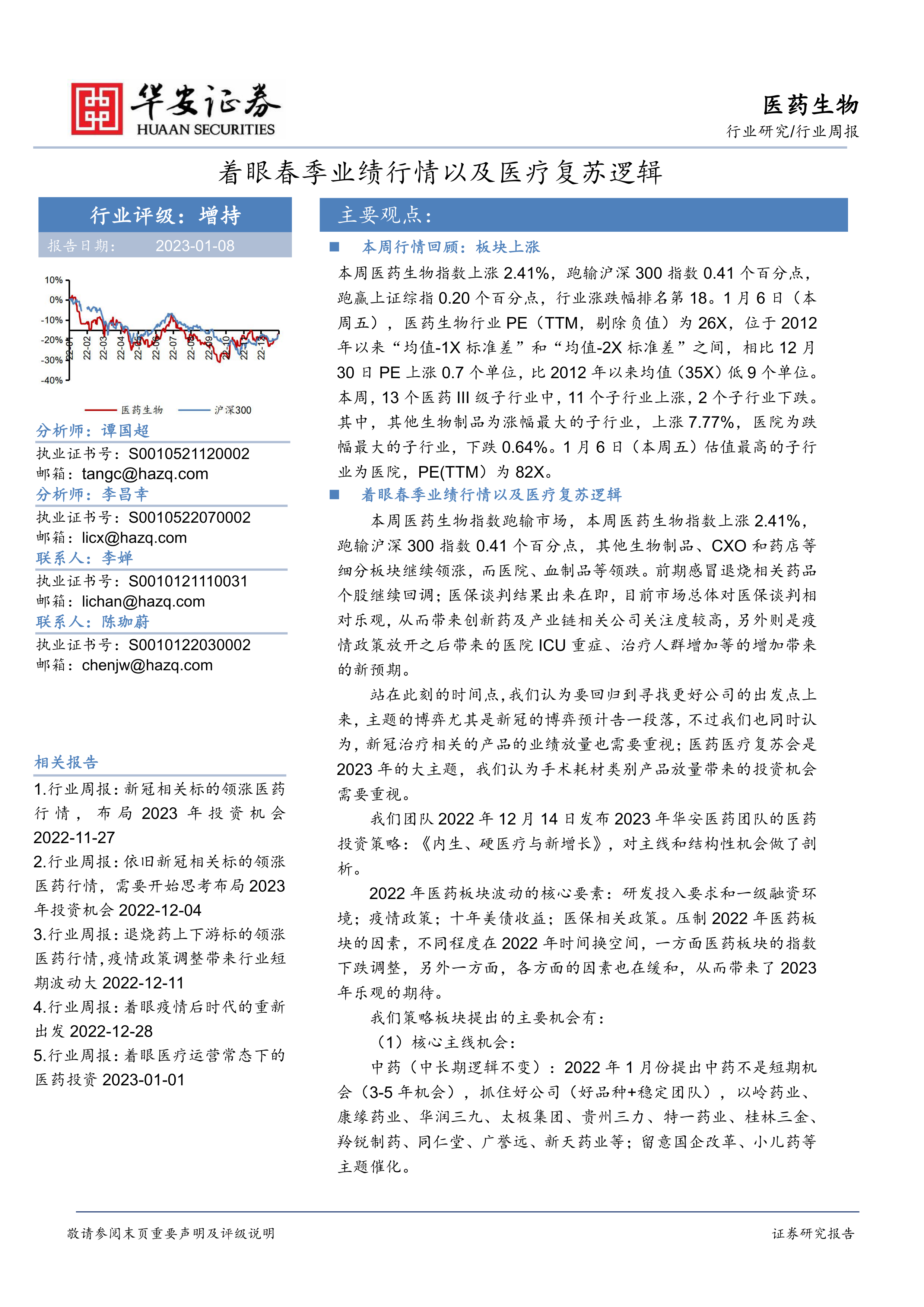 本报告的核心观点是:医药生物行业在2023年春季有望迎来业绩行情和医疗复苏,但需关注个股差异化表现。
