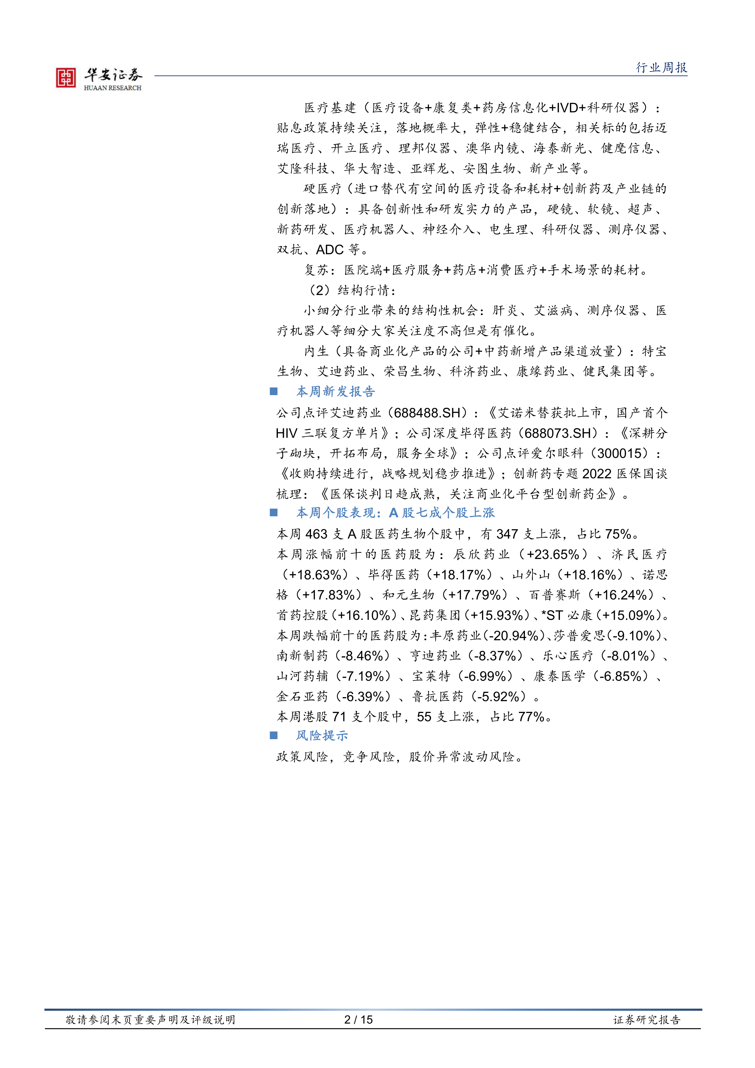 公司点评艾迪药业(688488.SH):《艾诺米替获批上市,国产首个HIV三联复方单片》;公司深度毕得医药(688073.SH):《深耕分子砌块,开拓布局,服务全球》;公司点评爱尔眼科(300015):《收购持续进行,战略规划稳步推进》;创新药专题2022医保国谈梳理:《医保谈判日趋成熟,关注商业化平台型创新药企》。