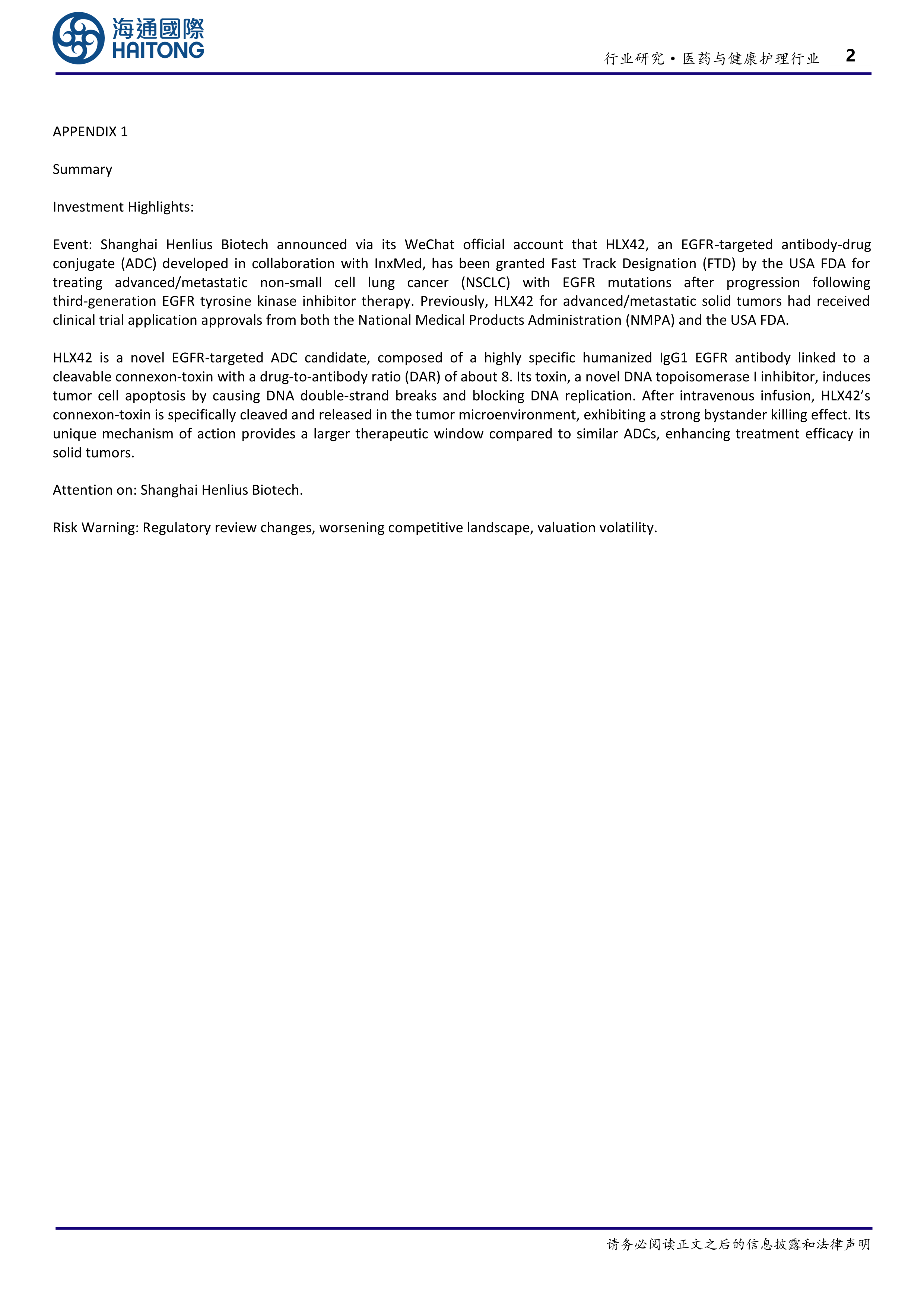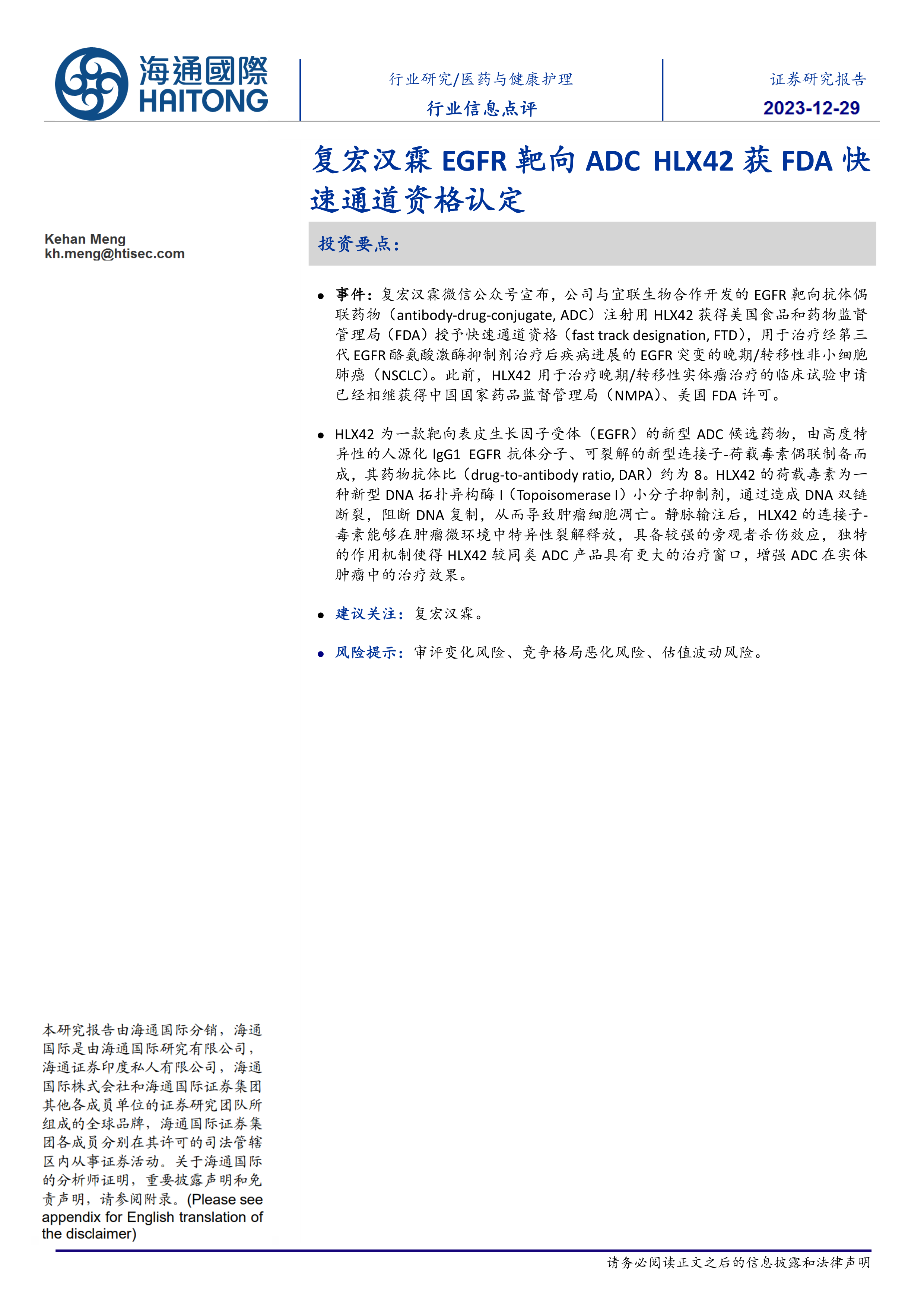 本报告的核心观点是:复宏汉霖与宜联生物合作开发的EGFR靶向ADC药物HLX42获得FDA快速通道资格认定,这标志着HLX42在治疗EGFR突变的晚期/转移性非小细胞肺癌方面取得重大进展,并为复宏汉霖带来显著的市场机遇。 该事件将加速HLX42的研发进程和上市时间,提升其市场竞争力,并对公司未来发展产生积极影响。 然而,潜在的监管风险、市场竞争以及估值波动仍需关注。