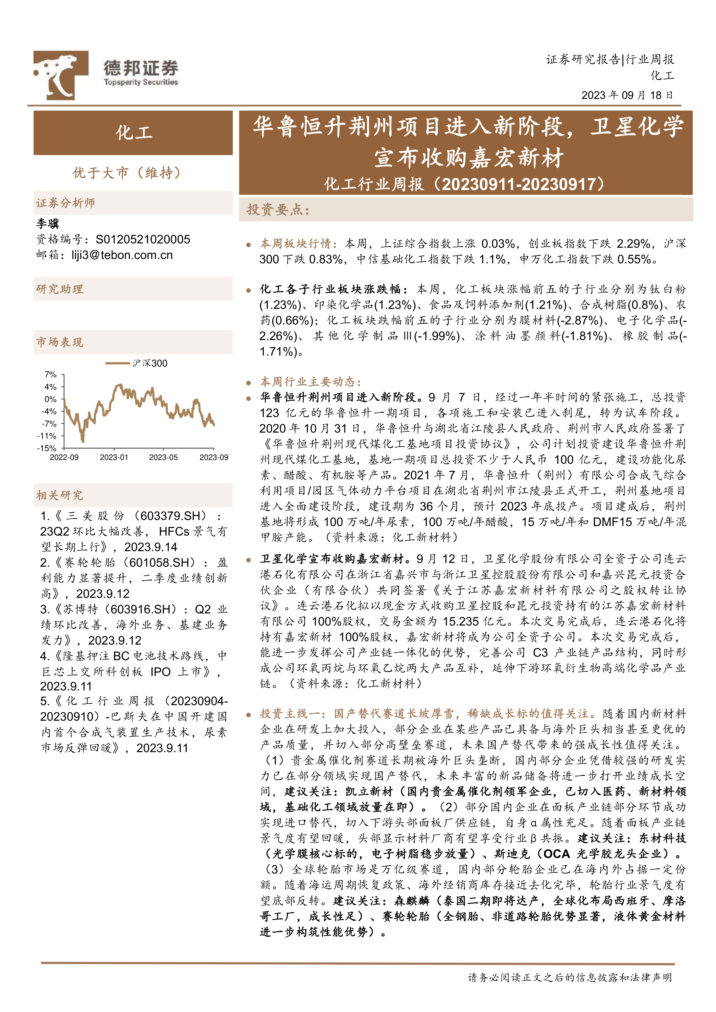 化工行业周报:华鲁恒升荆州项目进入新阶段,卫星化学宣布收购嘉宏新材