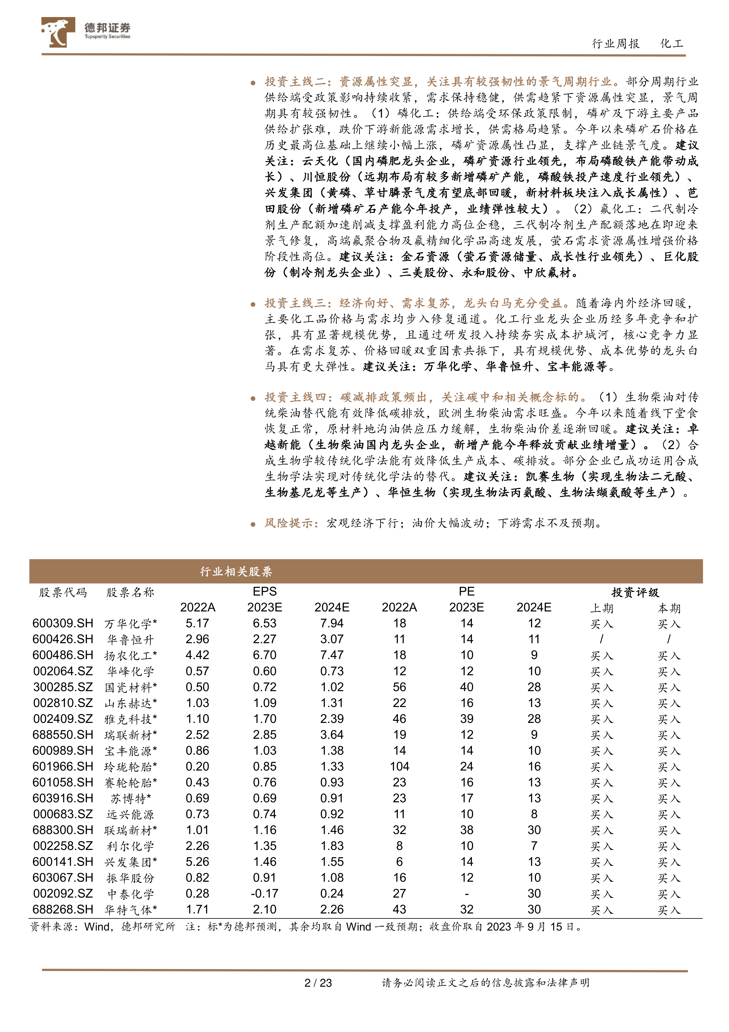投资主线二:资源属性突显,关注具有较强韧性的景气周期行业。 部分周期行业供给端受政策影响持续收紧,需求保持稳健,供需趋紧下资源属性突显,景气周期具有较强韧性。( 1)磷化工:供给端受环保政策限制,磷矿及下游主要产品供给扩张难,跌价下游新能源需求增长,供需格局趋紧。今年以来磷矿石价格在历史最高位基础上继续小幅上涨,磷矿资源属性凸显,支撑产业链景气度。 建议关注:云天化(国内磷肥龙头企业,磷矿资源行业领先,布局磷酸铁产能带动成长)、川恒股份(远期布局有较多新增磷矿产能,磷酸铁投产速度行业领先)、兴发集团(黄磷、草甘膦景气度有望底部回暖,新材料板块注入成长属性)、芭田股份(新增磷矿石产能今年投产,业绩弹性较大) 。( 2)氟化工:二代制冷剂生产配额加速削减支撑盈利能力高位企稳,三代制冷剂生产配额落地在即迎来景气修复,高端氟聚合物及氟精细化学品高速发展,萤石需求资源属性增强价格阶段性高位。 建议关注:金石资源(萤石资源储量、成长性行业领先)、巨化股份(制冷剂龙头企业)、三美股份、 永和股份、中欣氟材。