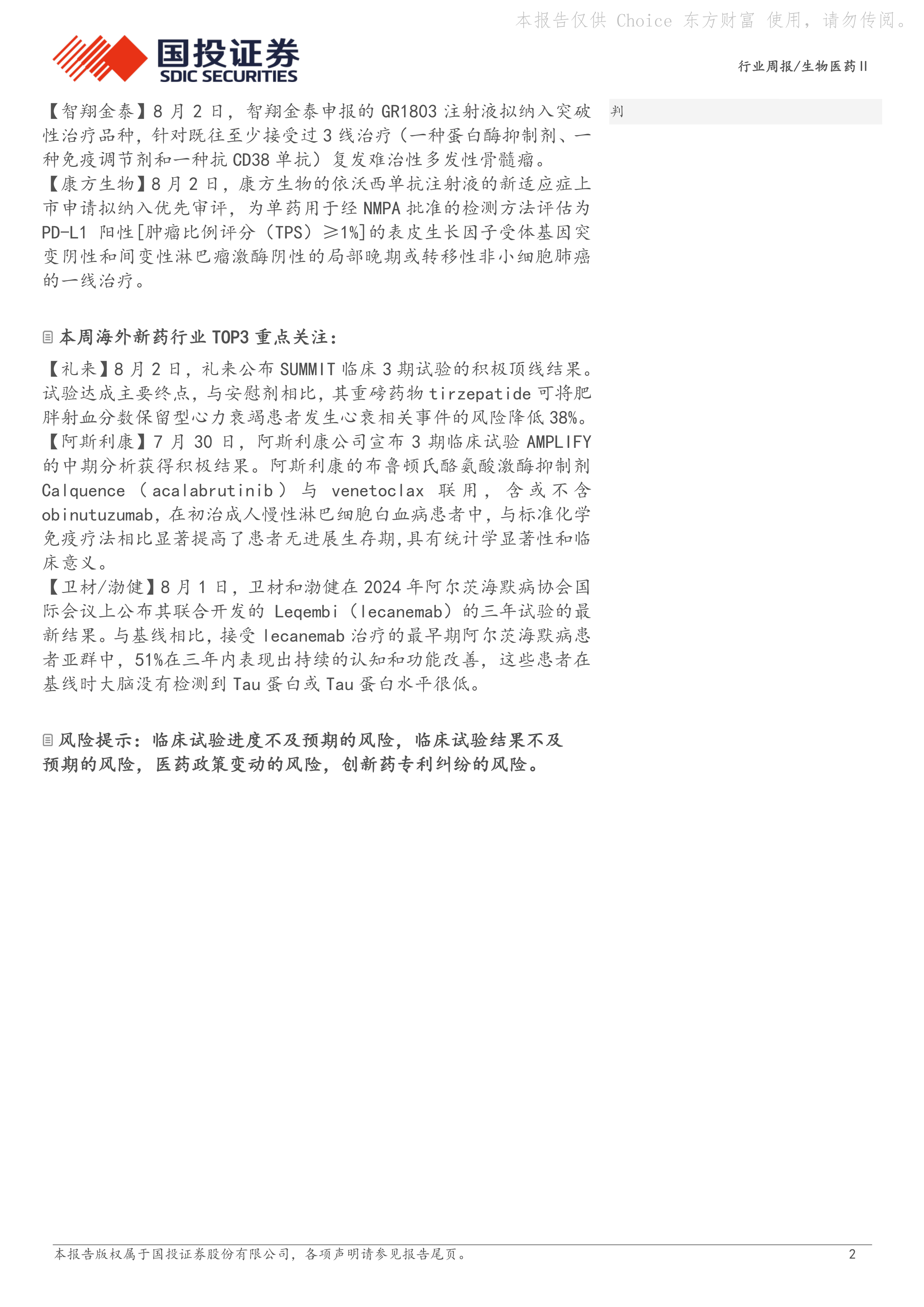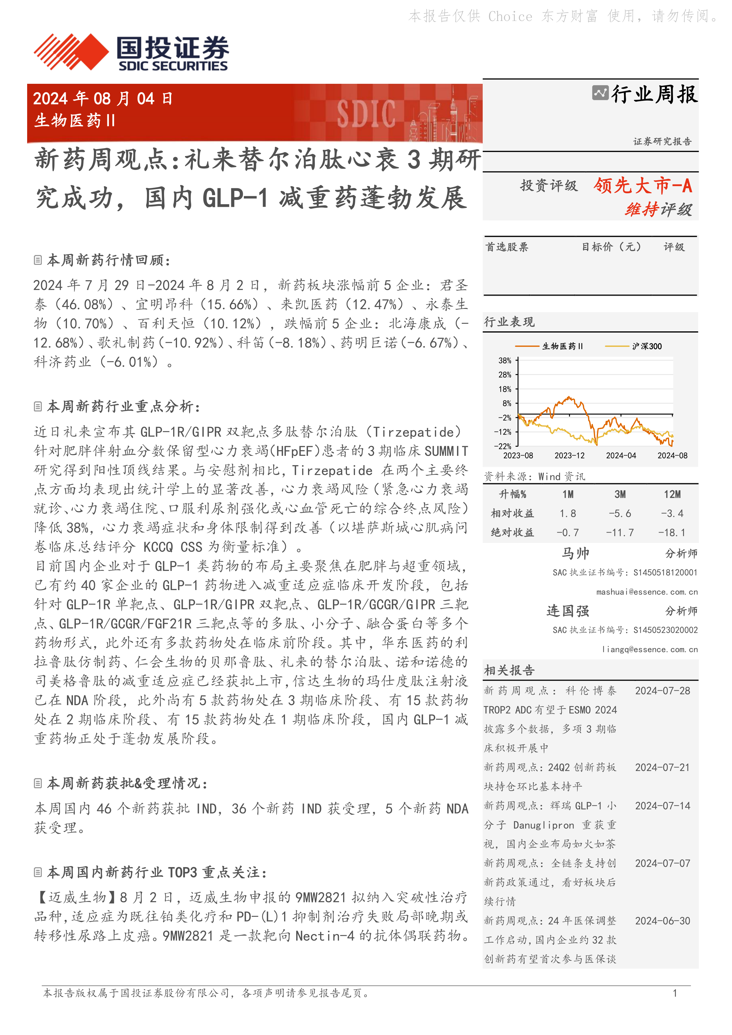 本报告对2024年8月4日一周的生物医药行业,特别是新药领域进行了市场分析。礼来公司替尔泊肽的临床试验成功,以及国内GLP-1类减重药物市场的蓬勃发展是本周的行业焦点。报告详细列举了国内外新药的研发进展、获批和受理情况,并对部分重点企业和药物进行了深入分析,为投资者提供了有价值的参考信息。 然而,报告中部分数据和信息较为简略,缺乏更深入的市场规模、竞争格局和财务数据分析,这限制了报告的全面性和深度。 未来研究可以进一步补充这些数据,并对市场趋势进行更深入的预测。