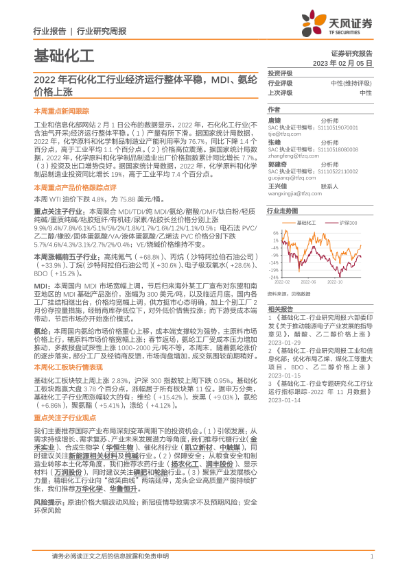 基础化工行业研究周报:2022年石化化工行业经济运行整体平稳,MDI、氨纶价格上涨