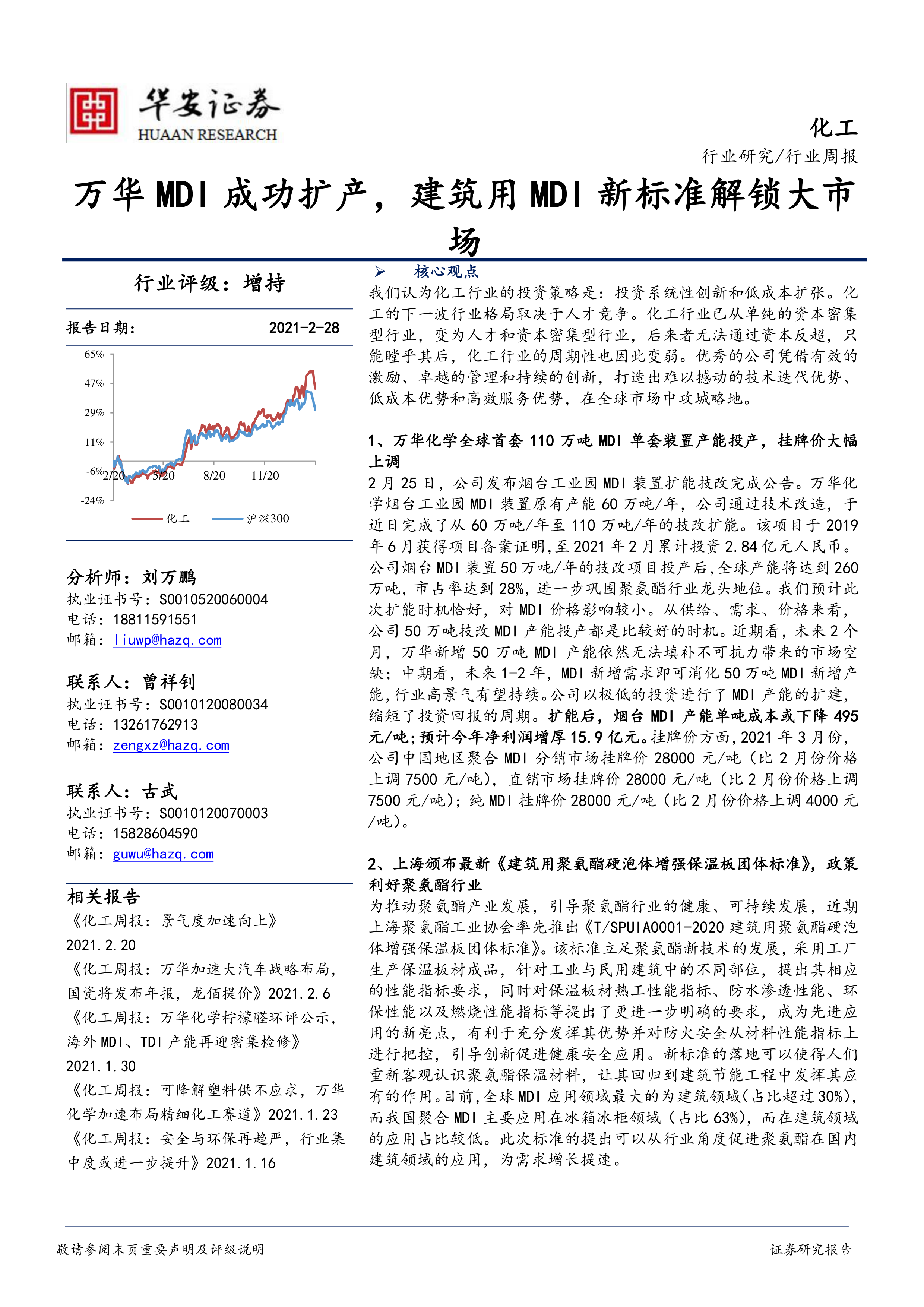2月25日,公司发布烟台工业园MDI装置扩能技改完成公告。万华化学烟台工业园MDI装置原有产能60万吨/年,公司通过技术改造,于近日完成了从60万吨/年至110万吨/年的技改扩能。该项目于2019年6月获得项目备案证明,至2021年2月累计投资2.84亿元人民币。公司烟台MDI装置50万吨/年的技改项目投产后,全球产能将达到260万吨,市占率达到28%,进一步巩固聚氨酯行业龙头地位。我们预计此次扩能时机恰好,对MDI价格影响较小。从供给、需求、价格来看,公司50万吨技改MDI产能投产都是比较好的时机。近期看,未来2个月,万华新增50万吨MDI产能依然无法填补不可抗力带来的市场空缺;中期看,未来1-2年,MDI新增需求即可消化50万吨MDI新增产能,行业高景气有望持续。公司以极低的投资进行了MDI产能的扩建,缩短了投资回报的周期。扩能后,烟台MDI产能单吨成本或下降495元/吨;预计今年净利润增厚15.9亿元。挂牌价方面,2021年3月份,公司中国地区聚合MDI分销市场挂牌价28000元/吨(比2月份价格上调7500元/吨),直销市场挂牌价28000元/吨(比2月份价格上调7500元/吨);纯MDI挂牌价28000元/吨(比2月份价格上调4000元/吨)。