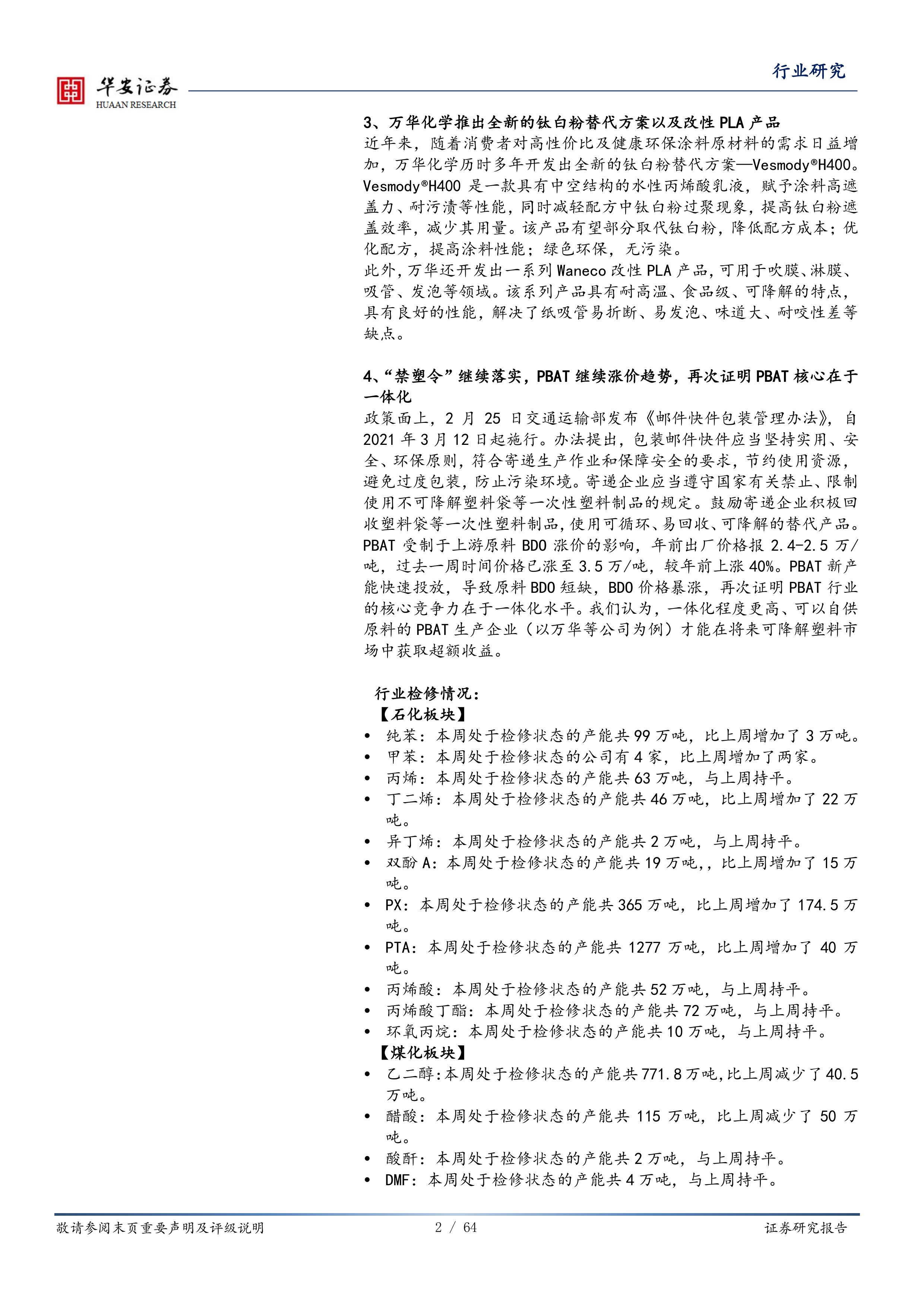 报告对多家重点化工公司进行了跟踪,包括万华化学、国瓷材料、龙蟒佰利、金禾实业、扬农化工、华鲁恒升、光威复材等国内公司,以及巴斯夫、科思创、埃克森美孚等国际公司。跟踪内容涵盖公司信息更新、市场表现、专利信息、投资项目、价格信息、以及一些重要的行业信息。例如,万华化学在生物降解材料、钛白粉替代方案、MDI扩产等方面的进展;龙蟒佰利钛白粉生产线建设项目;巴斯夫高性能保温材料的应用以及专利诉讼结果;科思创在中国的销售业绩等。 通过对这些公司信息的梳理,可以更全面地了解化工行业的发展趋势和竞争格局。