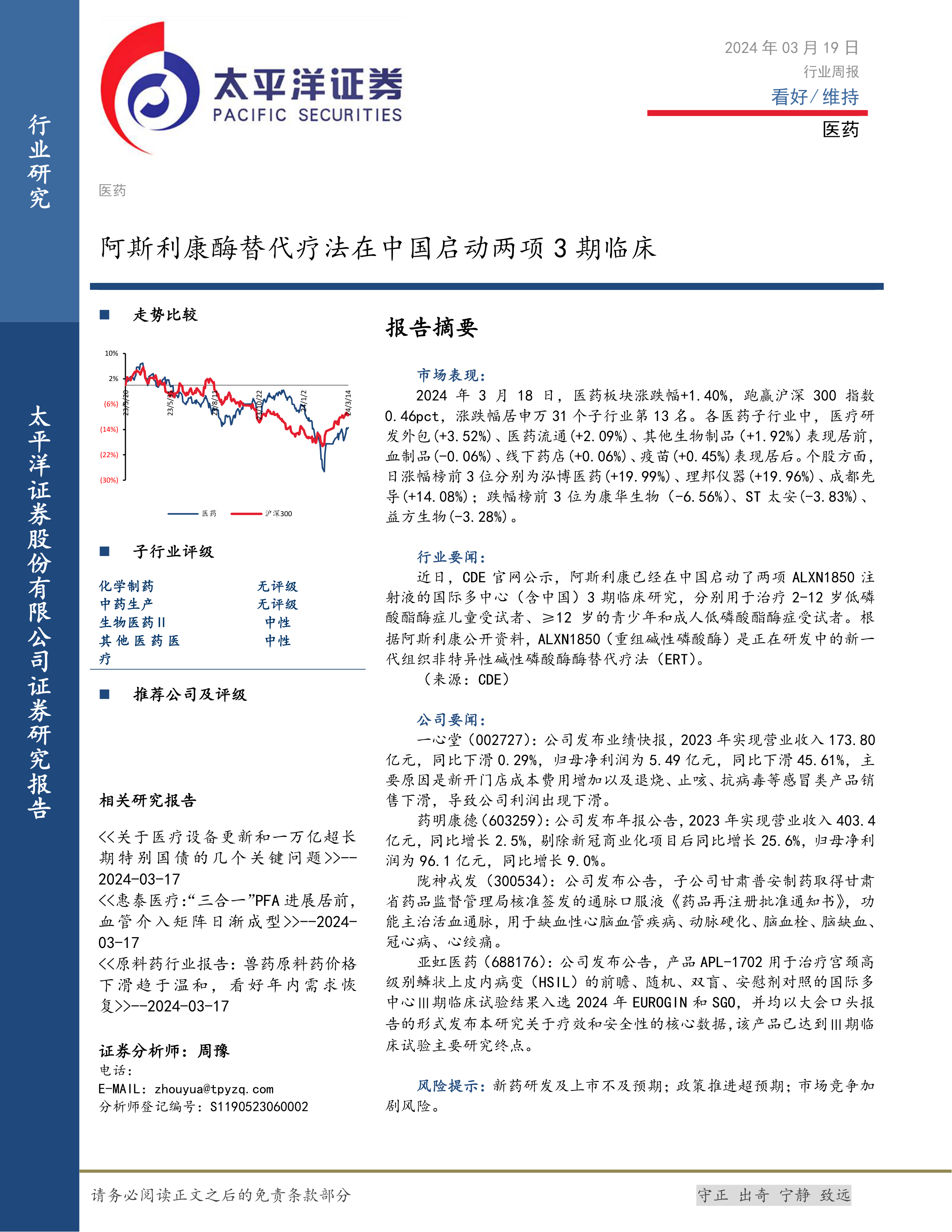报告提及一心堂、药明康德、陇神戎发、亚虹医药四家公司的业绩及公告信息。一心堂2023年业绩下滑,主要原因是新开门店成本增加以及感冒类产品销售下滑;药明康德2023年业绩增长,剔除新冠商业化项目后增长显著;陇神戎发子公司取得通脉口服液再注册批准通知书;亚虹医药产品APL-1702的Ⅲ期临床试验结果入选国际会议,并达到主要研究终点。这些信息反映出医药公司业绩及研发进展存在差异,投资者需关注公司基本面。