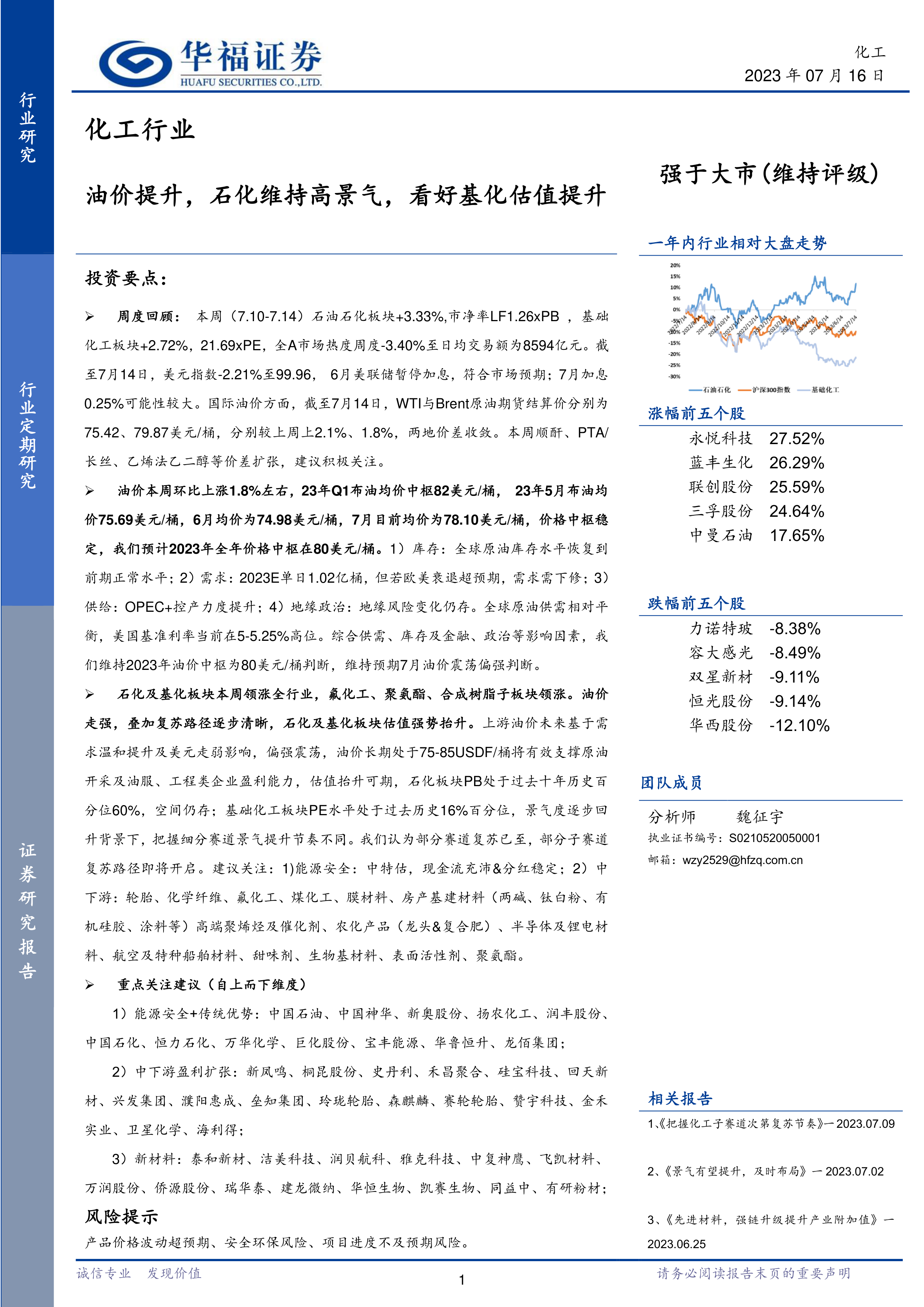 化工行业:油价提升,石化维持高景气,看好基化估值提升