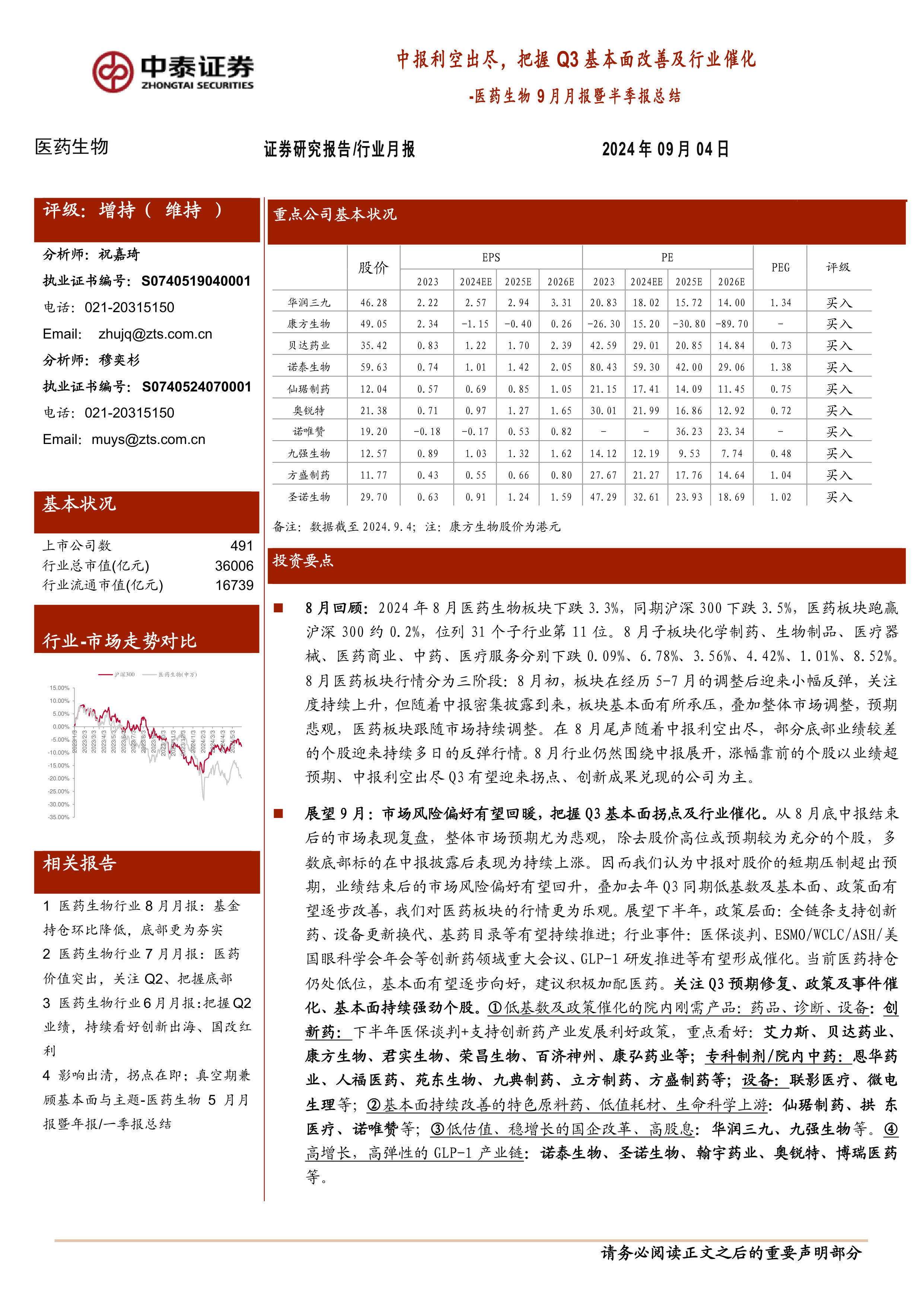 9月重点推荐:华润三九、康方生物、贝达药业、诺泰生物、仙琚制药、奥锐特、诺唯赞、九强生物、方盛制药、圣诺生物