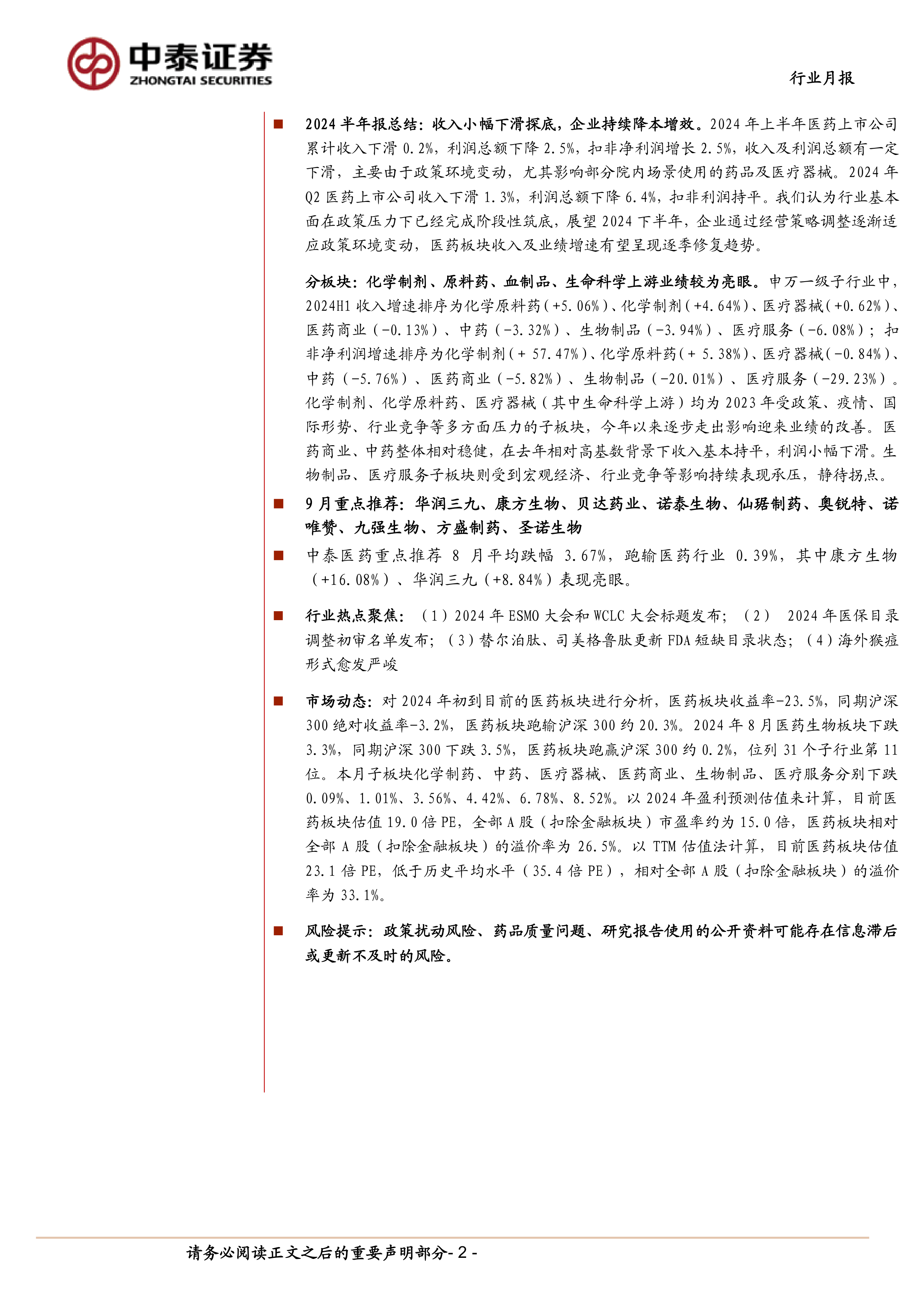 本报告为医药生物行业9月月报暨半季报总结,主要内容包括:行业市场走势分析、2024年中报总结、9月重点推荐个股及组合、行业热点聚焦以及风险提示。