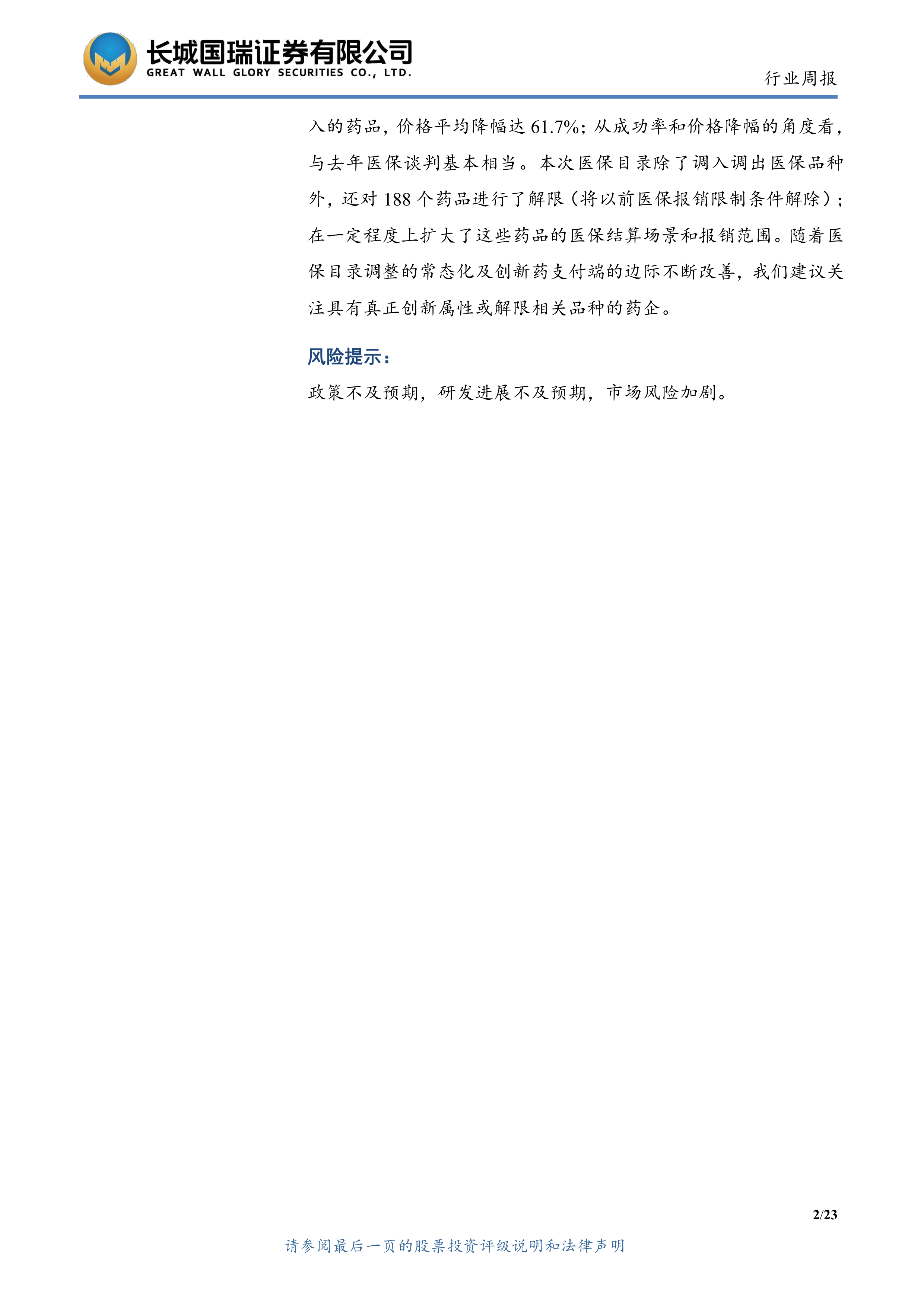 新版医保目录于上周正式对外发布, 参加医保谈判的 143 个目录外药品中有 121 个谈判或竞价成功, 成功率达到 84.6%; 谈判和竞价新准入的药品, 价格平均降幅达 61.7%; 从成功率和价格降幅的角度看,与去年医保谈判基本相当。 本次医保目录除了调入调出医保品种外, 还对 188 个药品进行了解限(将以前医保报销限制条件解除) ;在一定程度上扩大了这些药品的医保结算场景和报销范围。 随着医保目录调整的常态化及创新药支付端的边际不断改善, 我们建议关注具有真正创新属性或解限相关品种的药企。