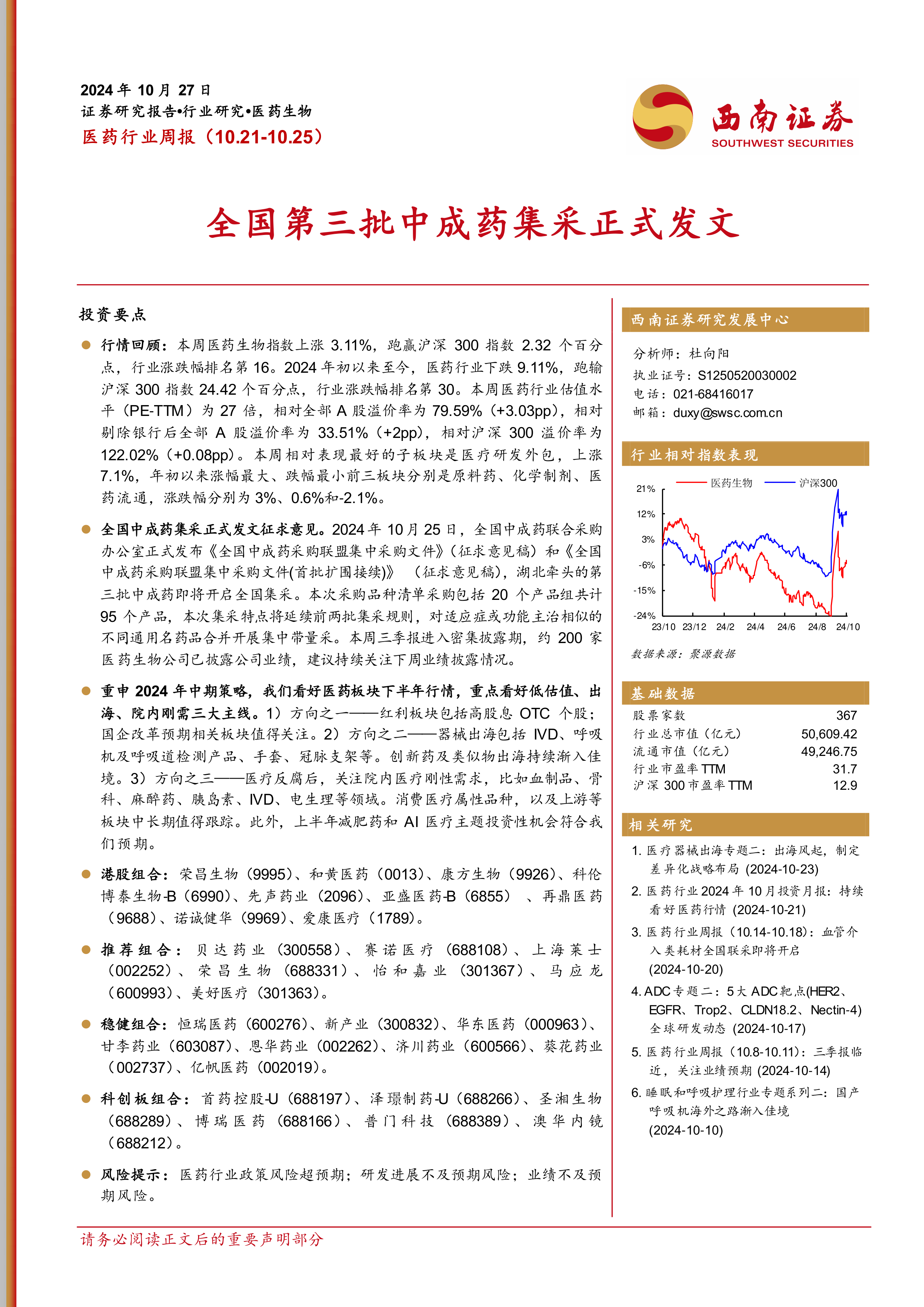 报告重点关注了全国第三批中成药集采政策的正式发布,分析了其对医药行业的影响。 同时,报告也指出本周医药公司三季报进入密集披露期,建议投资者持续关注下周的业绩披露情况。 这部分内容体现了报告对政策和市场动态的及时跟踪和分析。