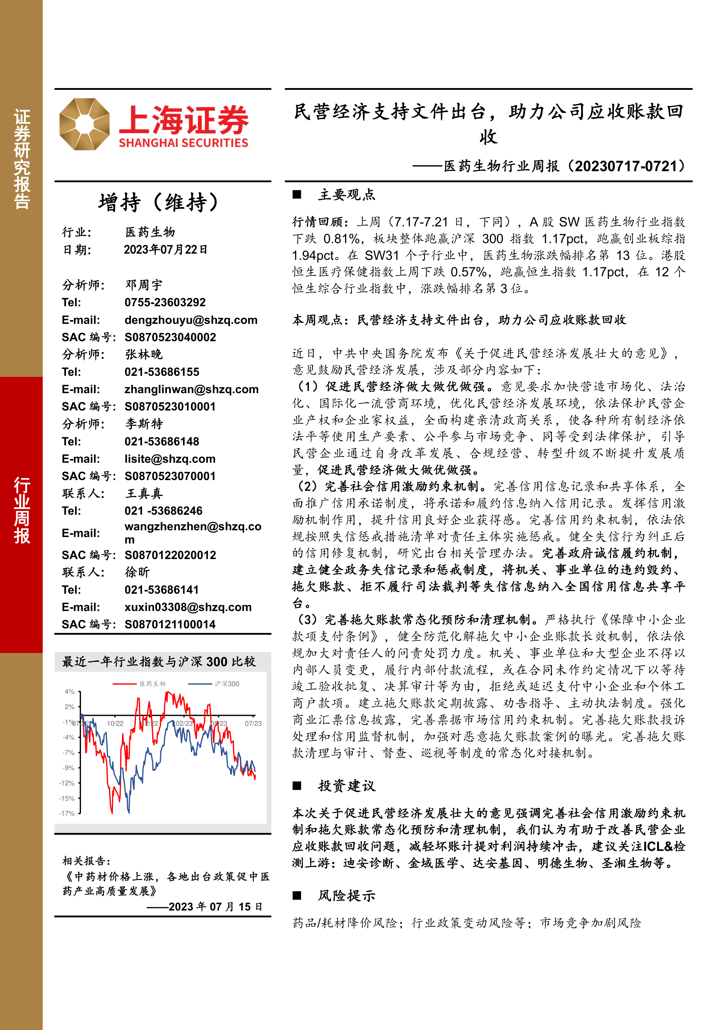 医药生物行业周报:民营经济支持文件出台,助力公司应收账款回收