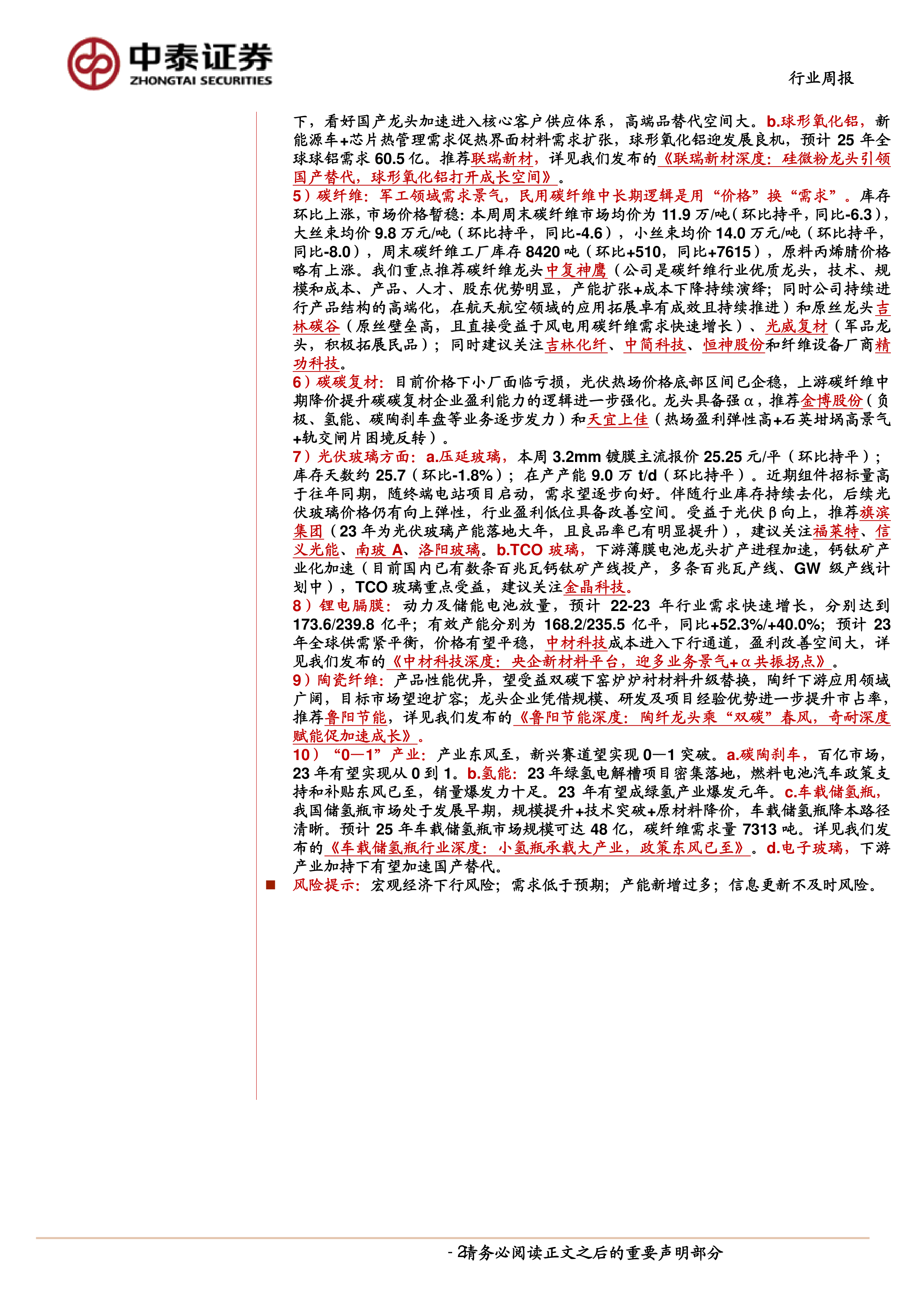 本周重点事件:1)石英股份盈利弹性继续释放,矿源有保障支撑销量高增。7月12日公司发布业绩预告,预计23H1实现归母净利22.9-25.0亿,同比增长693.5%-765.3%;实现扣非净利润22.6-24.7亿,同比增长682.2%-753.0%。预计单2季度实现归母净利润中值15.7亿,同比增长683%,环比增长92%。公司近日发布公告并在公开渠道反馈表明,此前传言印度禁止石英矿出口无事实依据和法律依据,印度官方无公告所述对华禁运事项,目前印度对华矿石出口业务正常。且公司石英矿石来源广泛,国内外均有稳定供货,并不依赖印度进口,另我们估算公司库存矿亦可用1年以上,后续不排除向上游做产业链延伸。2)光威复材23H1预盈4.1亿元,碳纤维、风电碳梁等业务收入下滑。7月12日公司发布业绩预告,预计23H1实现营业收入12.2亿元,同比-6.9%;实现归母净利4.1亿,-18.2%;实现扣非净利润3.9亿,同比-19.8%。主要受传统定型产品发货节奏以及风电碳梁业务下滑影响,公司经营业绩同比下降。其中,碳纤维(含织物)业务实现营业收入7.7亿元,同比-4.2%;风电碳梁业务实现营业收入2.3亿元,同比-28.2%;预浸料业务实现营业收入1.5亿元,同比+7.0%;先进复合材料业务实现营业收入0.6亿元,同比+94.88%。3)本周我们发布了金宏气体深度报告《渠道为核、特气跃迁,纵横发展领军者》。金宏气体坚定贯彻纵横发展战略,横向扩张是以增加服务区域为核,以新建或收并购的形式进行跨区域的布局;纵向延伸是以丰富服务手段为核,拓展产品品类、开拓服务场景以及拓展服务模式。我们认为公司作为国内工业气体民营领军者,坚持贯彻纵横发展战略,在大宗气体和特种气体的双轮驱动下,兼具成长弹性及持续性。4)本周我们发布了山东药玻深度报告《行业龙头厚积薄发,中硼硅升级续写成长》。公司产品升级+降成本,远期成长空间广阔,短期成长确定性亦强。一致性评价与集采稳步推进下,公司大单品中硼硅模制瓶持续平稳放量,高毛利支撑公司成长持续兑现。在顺周期难见拐点情况下,药玻产品升级逻辑攻防属性兼备,叠加原燃料成本回落趋势显著,公司盈利弹性释放可期。