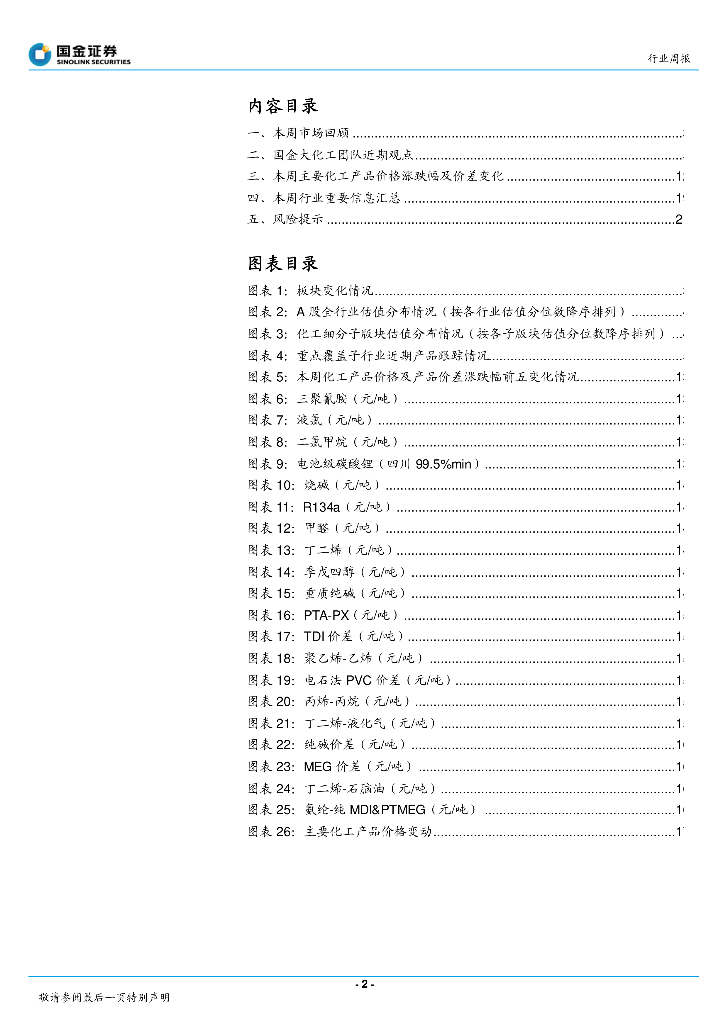 本报告对本周化工市场进行了全面的回顾和分析,指出新材料板块景气度向上,值得关注。报告详细分析了多个重点化工子行业和公司的市场表现,并对未来走势进行了预测,同时指出了行业面临的主要风险。报告数据翔实,分析深入,为投资者提供了有价值的参考信息。 报告建议投资者关注新材料板块以及具有技术壁垒和政策支持的细分领域,同时需密切关注宏观经济环境、原油价格波动以及疫情发展等因素对化工行业的影响。