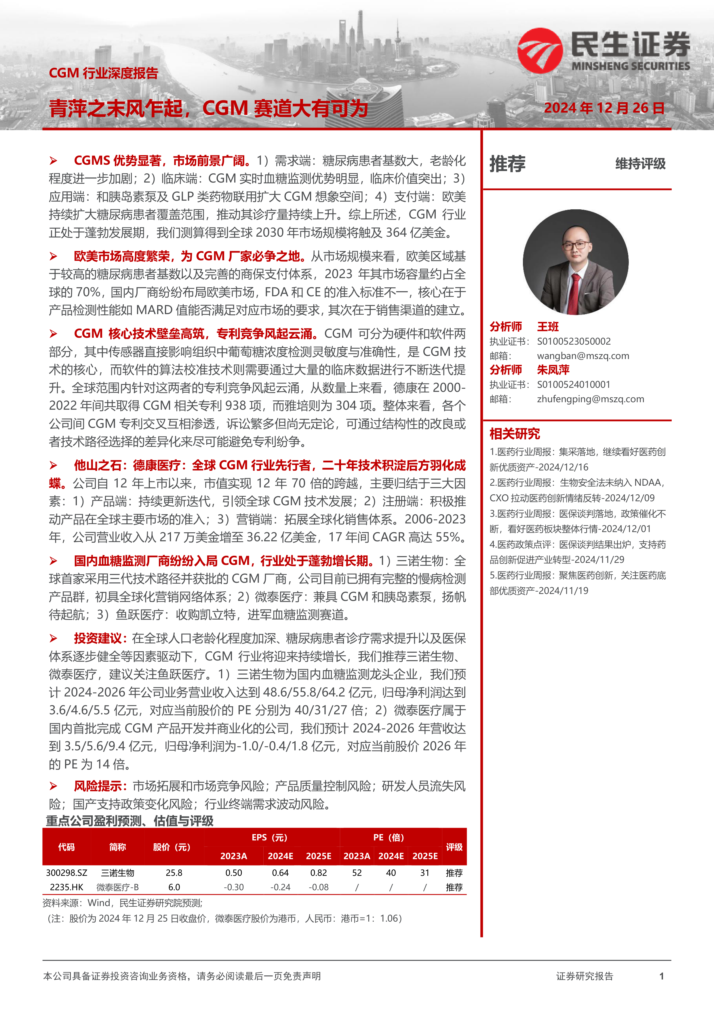 CGM行业发展前景广阔,市场规模将持续增长。欧美市场竞争激烈,国内厂商需积极布局,提升产品竞争力。国内厂商在技术创新、市场拓展和全球化战略方面面临机遇与挑战,需加强研发投入,提升产品质量,完善营销体系,才能在激烈的市场竞争中脱颖而出。 本报告对三诺生物和微泰医疗给予“推荐”评级,并对鱼跃医疗提出关注建议,但投资者需谨慎评估相关风险。