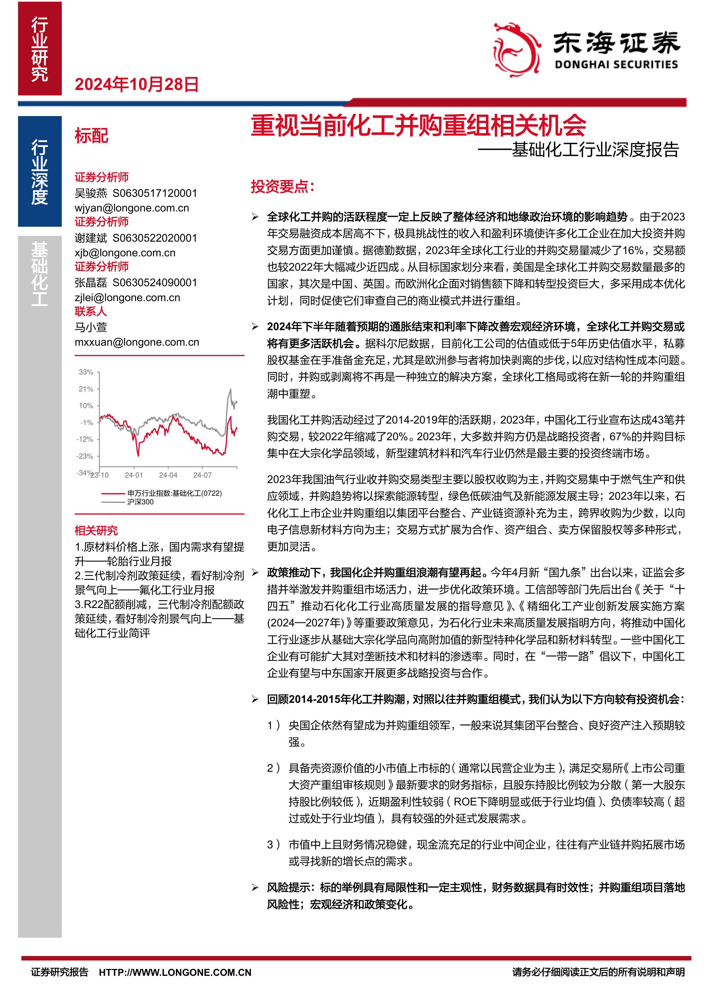 政策推动下,我国化企并购重组浪潮有望再起。今年4月新“国九条”出台以来,证监会多措并举激发并购重组市场活力,进一步优化政策环境。工信部等部门先后出台《关于“十四五”推动石化化工行业高质量发展的指导意见》、《精细化工产业创新发展实施方案(2024—2027年)》等重要政策意见,为石化行业未来高质量发展指明方向,将推动中国化工行业逐步从基础大宗化学品向高附加值的新型特种化学品和新材料转型。一些中国化工企业有可能扩大其对垄断技术和材料的渗透率。同时,在“一带一路”倡议下,中国化工企业有望与中东国家开展更多战略投资与合作。