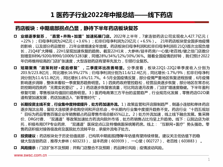 风险提示:门店扩张不及预期;并购门店整合不及预期;药品降价风险;疫情波动风险。药店板块:中期底部拐点凸显,静待下半年药店板块复苏