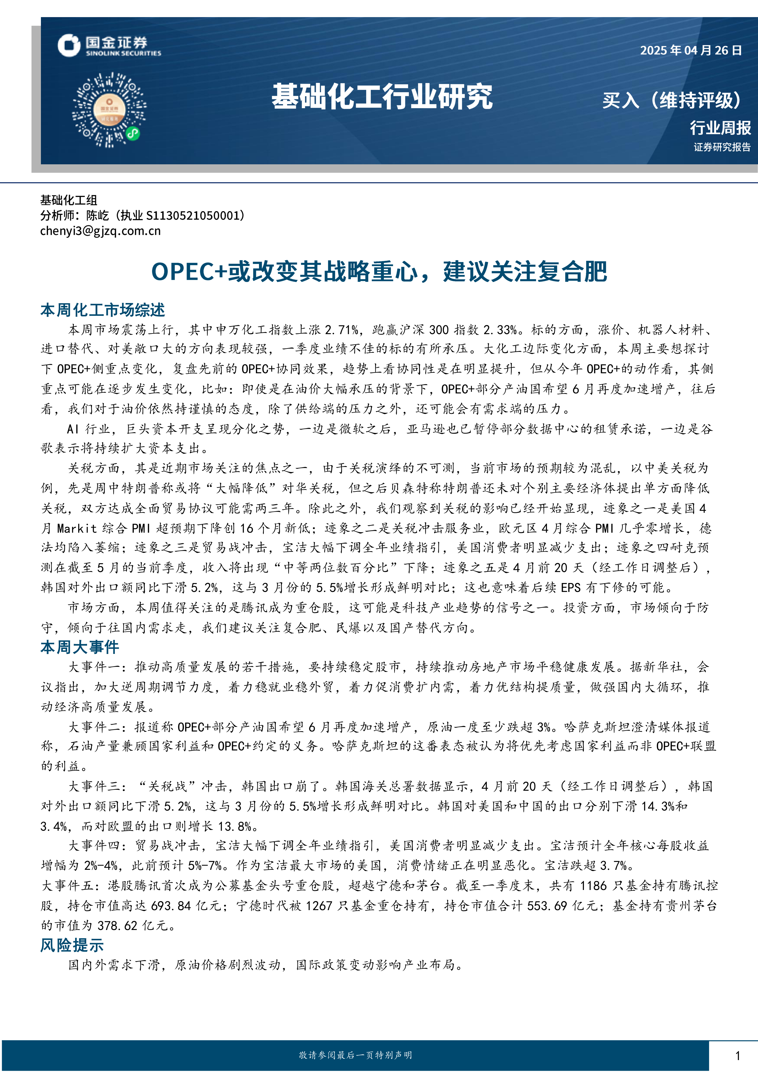 本报告的核心观点是:本周化工市场震荡上行,申万化工指数上涨2.71%,跑赢沪深300指数。涨价、机器人材料、进口替代和对美敞口大的方向表现较强,而一季度业绩不佳的标的则承压。大化工领域,OPEC+的侧重点可能发生变化,油价面临供需双重压力;AI行业巨头资本开支分化;关税战冲击全球经济,导致市场预期混乱,并已显现负面影响,例如美国和欧元区PMI下降,宝洁和耐克下调业绩指引,韩国出口下滑。市场倾向于防守和国内需求,建议关注复合肥、民爆和国产替代方向。
