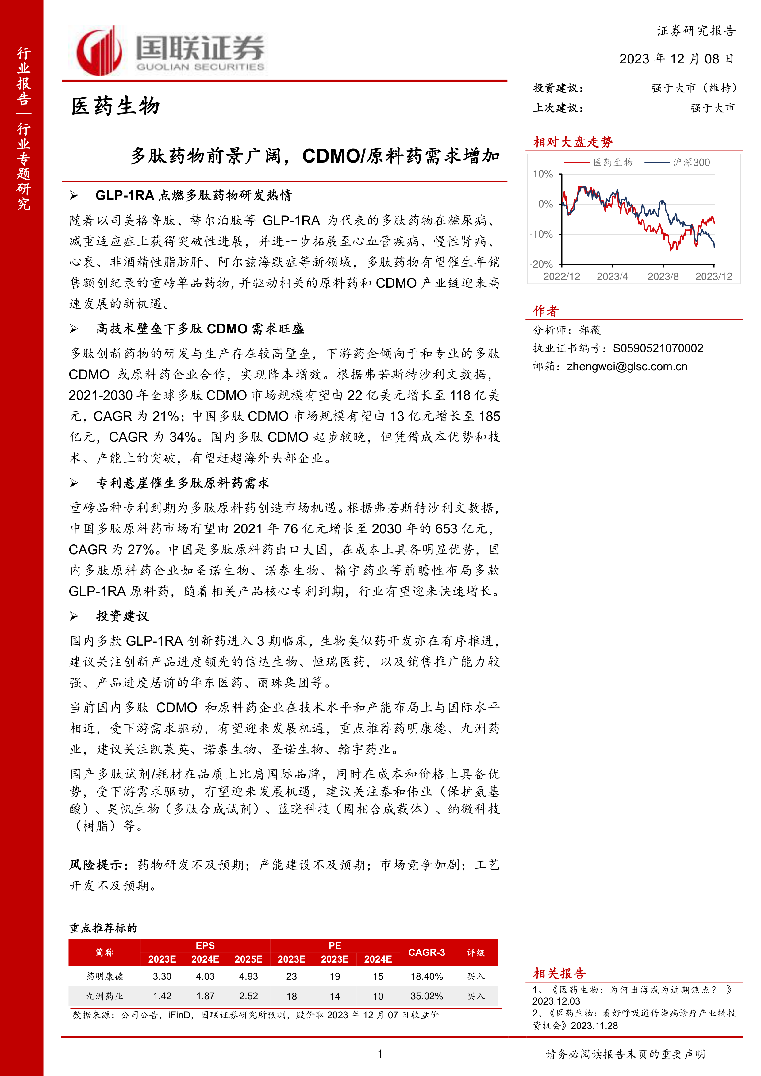 医药生物行业专题研究:多肽药物前景广阔,CDMO/原料药需求增加